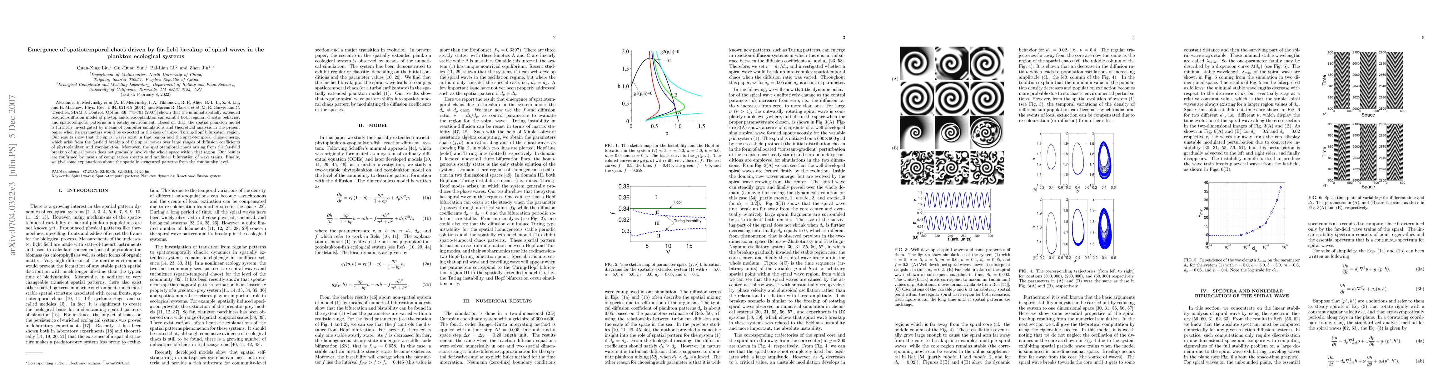 Alexander B. Medvinsky \emph{et al} [A. B. Medvinsky, I. A. Tikhonova, R. R. Aliev, B.-L. Li, Z.-S. Lin, and H. Malchow, Phys. Rev. E \textbf{64}, 021915 (2001)] and Marcus R. Garvie \emph{et al} [M. R. Garvie and C. Trenchea, SIAM J. Control. Optim. \textbf{46}, 775-791 (2007)] shown that the minimal spatially extended reaction-diffusion model of phytoplankton-zooplankton can exhibit both regular, chaotic behavior, and spatiotemporal patterns in a patchy environment. Based on that, the spatial plankton model is furtherly investigated by means of computer simulations and theoretical analysis in the present paper when its parameters would be expected in the case of mixed Turing-Hopf bifurcation region. Our results show that the spiral waves exist in that region and the spatiotemporal chaos emerge, which arise from the far-field breakup of the spiral waves over large ranges of diffusion coefficients of phytoplankton and zooplankton. Moreover, the spatiotemporal chaos arising from the far-field breakup of spiral waves does not gradually involve the whole space within that region. Our results are confirmed by means of computation spectra and nonlinear bifurcation of wave trains. Finally, we give some explanations about the spatially structured patterns from the community level.