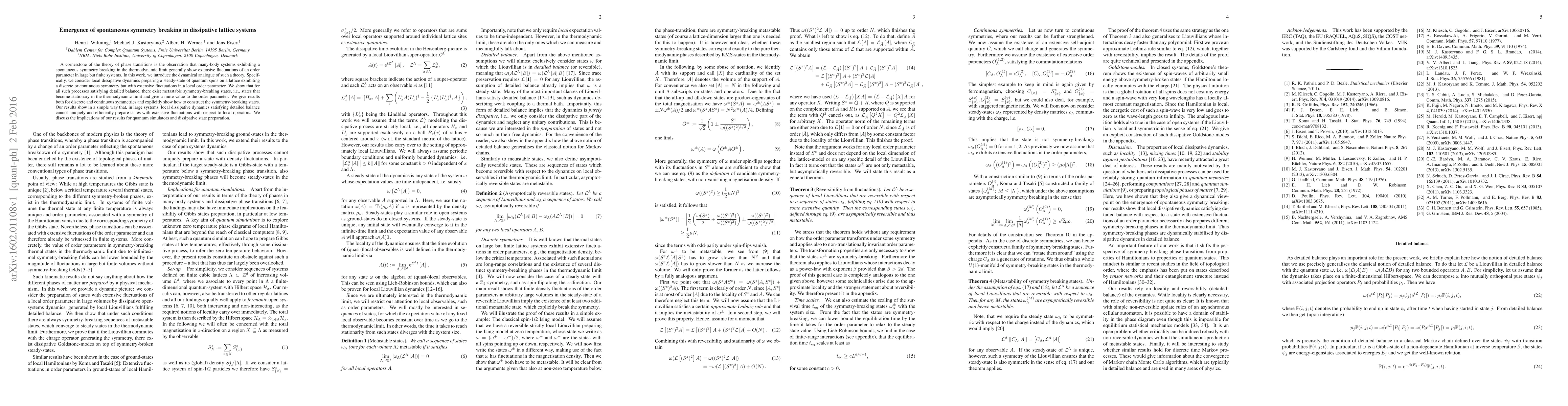 This research explores the emergence of spontaneous symmetry breaking in dissipative lattice systems, demonstrating the existence of metastable symmetry-breaking states in quantum spin systems with extensive fluctuations. The study highlights that local dissipative dynamics satisfying detailed balance cannot uniquely prepare states with such fluctuations, offering insights into quantum simulators and state preparation.
