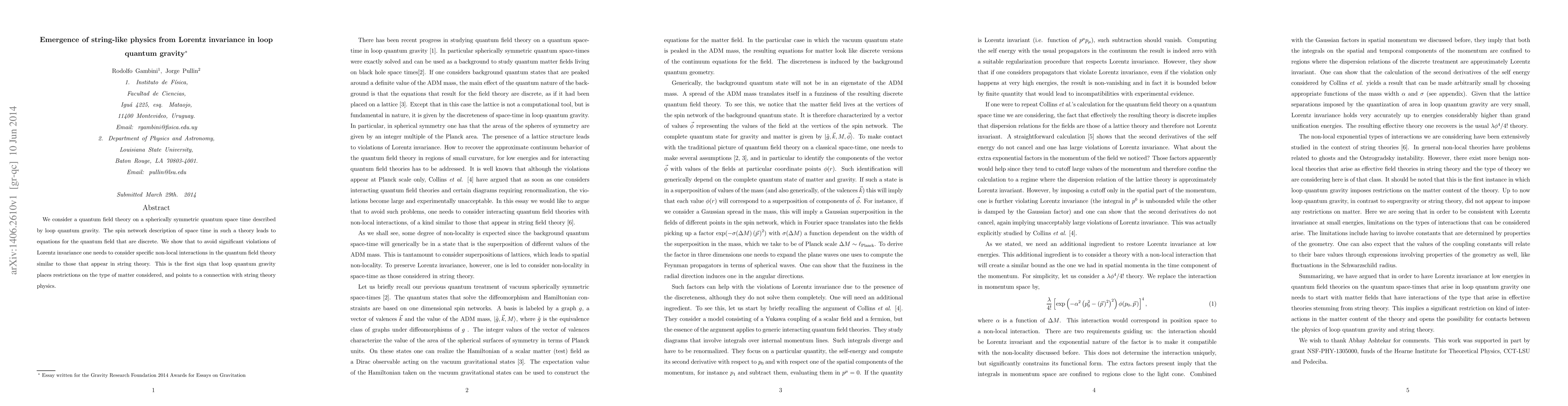 This paper demonstrates that loop quantum gravity, when applied to a spherically symmetric quantum spacetime, necessitates non-local interactions in the quantum field theory to maintain Lorentz invariance, hinting at a connection with string theory. This suggests loop quantum gravity imposes constraints on the matter types and reveals a potential link to string-like physics.