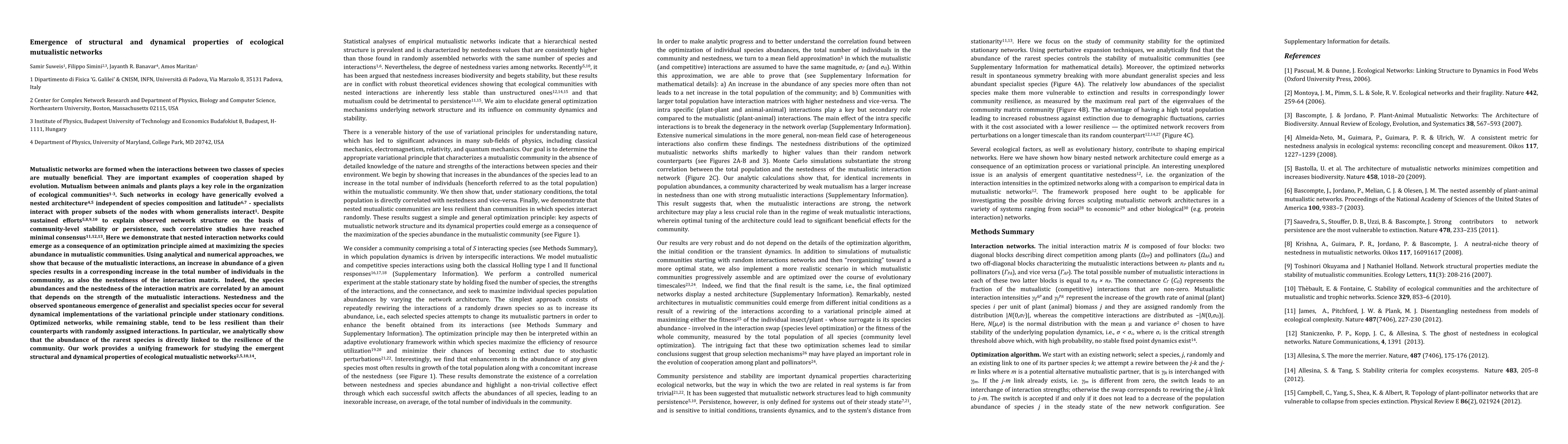 This paper investigates how nested mutualistic networks, where specialists and generalists interact, emerge through optimization principles aimed at maximizing species abundance. The study shows that such networks exhibit nestedness due to mutualistic interactions and provides a unifying framework for understanding their structural and dynamical properties, noting that optimized networks are stable but less resilient.