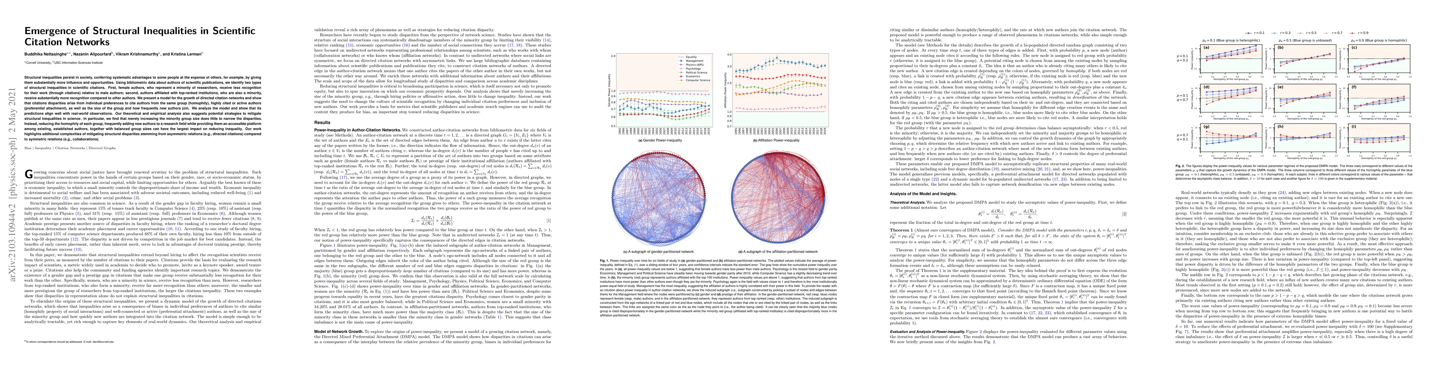 A study found that structural inequalities exist in scientific citation networks, with female authors receiving less recognition than male authors from top-ranked institutions. Increasing diversity through reduced homophily and frequent new author additions can mitigate these disparities.