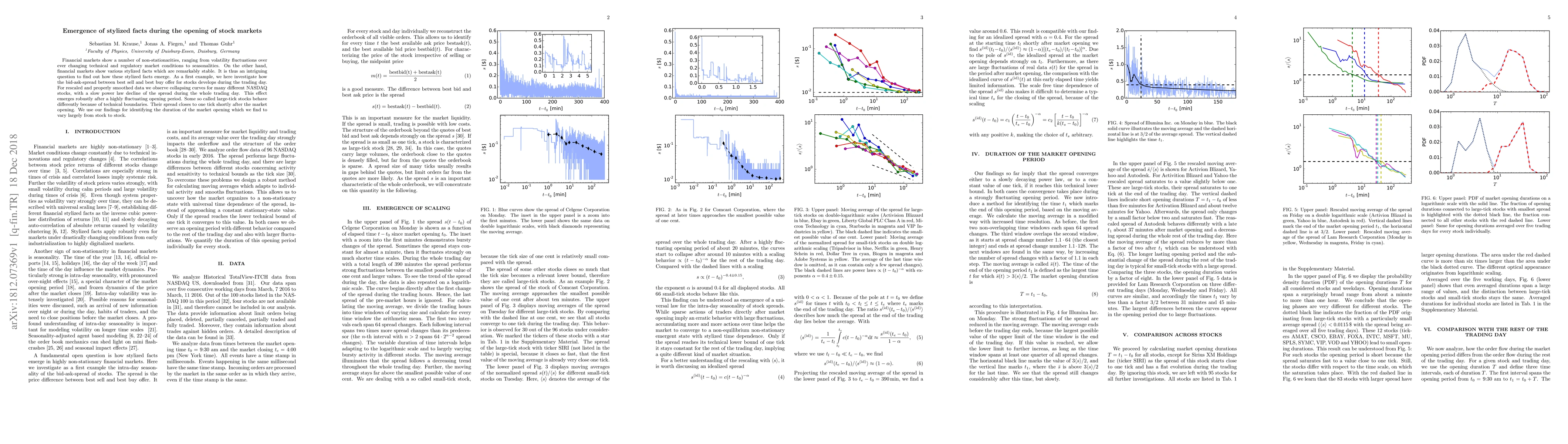 This paper investigates the emergence of stylized facts in financial markets, focusing on the bid-ask spread during the opening period of NASDAQ stocks. It finds a robust slow power law decline in the spread throughout the trading day, emerging after a fluctuating opening period, with large-tick stocks showing different behavior due to technical boundaries.