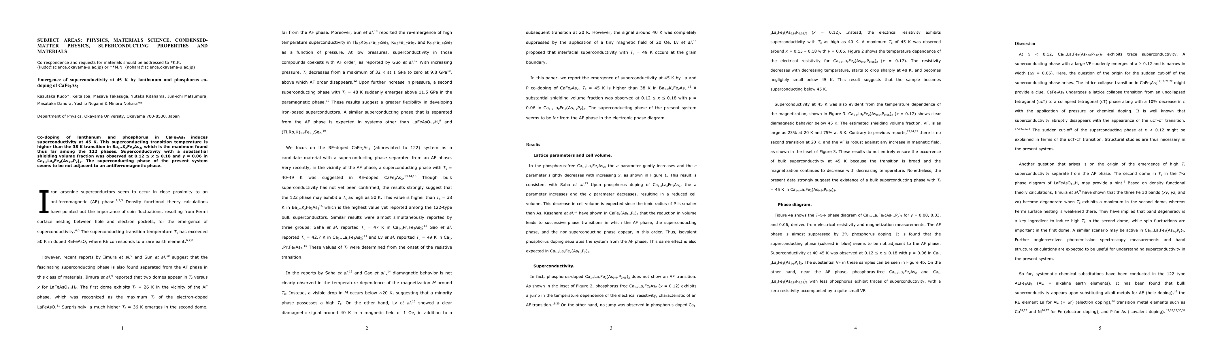 This study demonstrates that co-doping CaFe2As2 with lanthanum and phosphorus results in superconductivity at 45 K, surpassing the previous highest transition temperature of 38 K in Ba1-xKxFe2As2. The system exhibits substantial shielding at specific doping levels, indicating a stable superconducting phase free from adjacent antiferromagnetic phases.