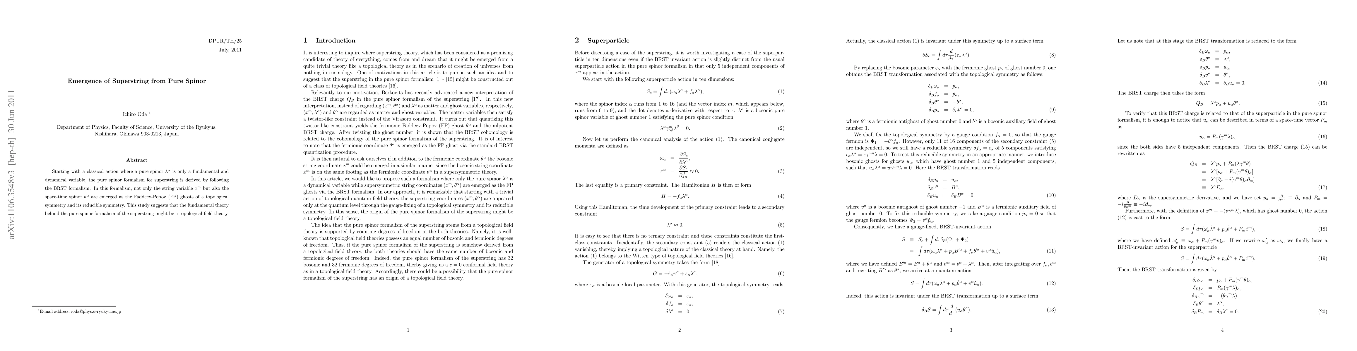 Starting with a classical action where a pure spinor $\lambda^\alpha$ is only a fundamental and dynamical variable, the pure spinor formalism for superparticle and superstring is derived by following the BRST formalism. In this formalism, not only the string variable $x^m$ but also the space-time spinor $\theta^\alpha$ are emerged as the Faddeev-Popov (FP) ghosts of a topological symmetry and its reducible symmetry. This study suggests that the fundamental theory behind the pure spinor formalism of the superstring might be a topological field theory.