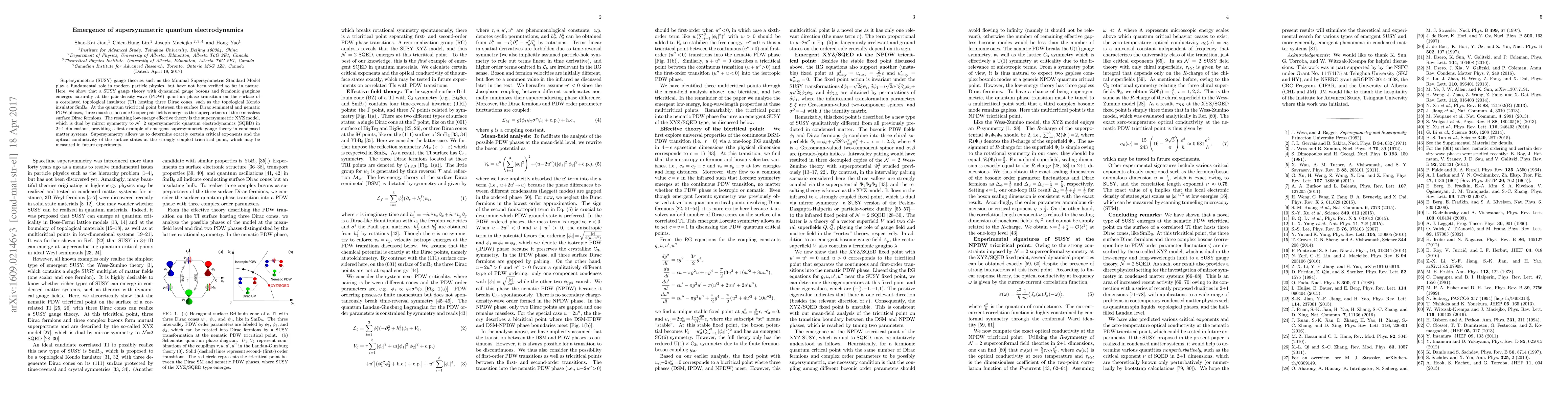 This paper demonstrates the emergence of a supersymmetric gauge theory at the quantum phase transition on the surface of a topological insulator, specifically the topological Kondo insulator SmB$_6$. The study reveals that the low-energy effective theory is a supersymmetric XYZ model, dual to $\mathcal{N}=2$ supersymmetric quantum electrodynamics, providing a first example of emergent supersymmetry in condensed matter systems.