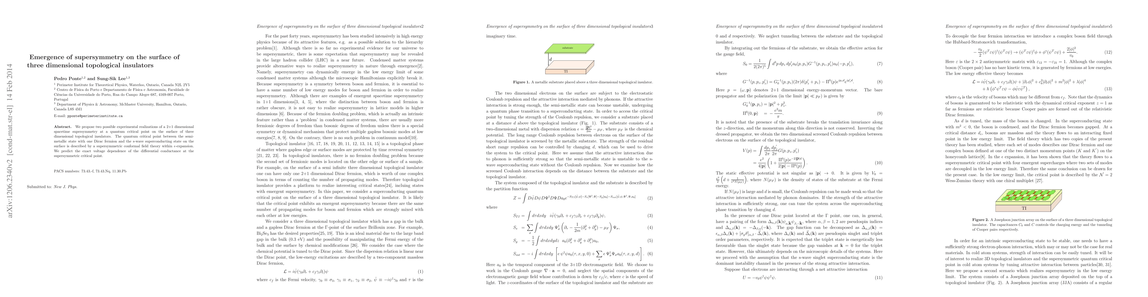 This paper proposes two experimental setups to realize 2+1 dimensional spacetime supersymmetry on the surface of three-dimensional topological insulators, describing a quantum critical point between a semi-metallic state and s-wave superconductivity with a supersymmetric conformal field theory, and predicts the voltage dependence of differential conductance at this critical point.