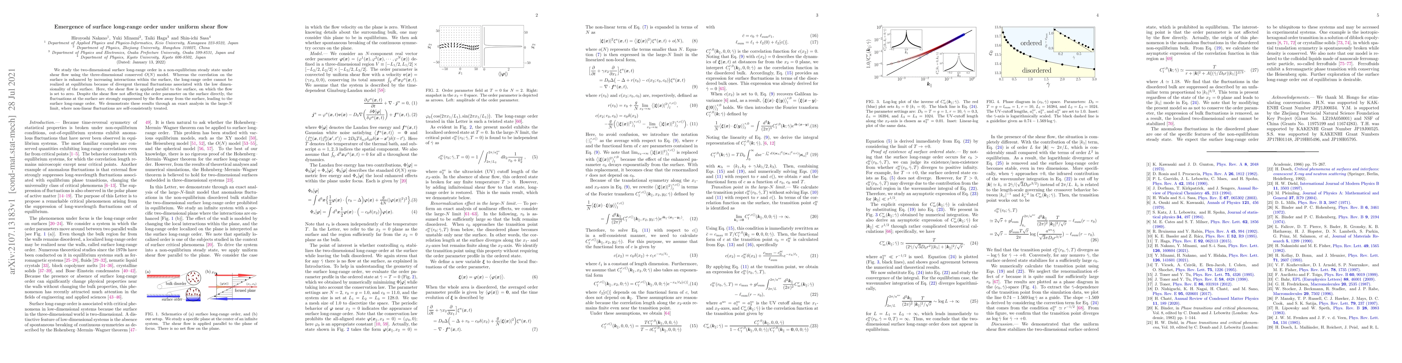 This paper investigates the emergence of two-dimensional surface long-range order in a non-equilibrium steady state under uniform shear flow using the conserved $O(N)$ model. Despite the shear flow not directly affecting the surface, it suppresses fluctuations away from the surface, leading to the realization of surface long-range order.