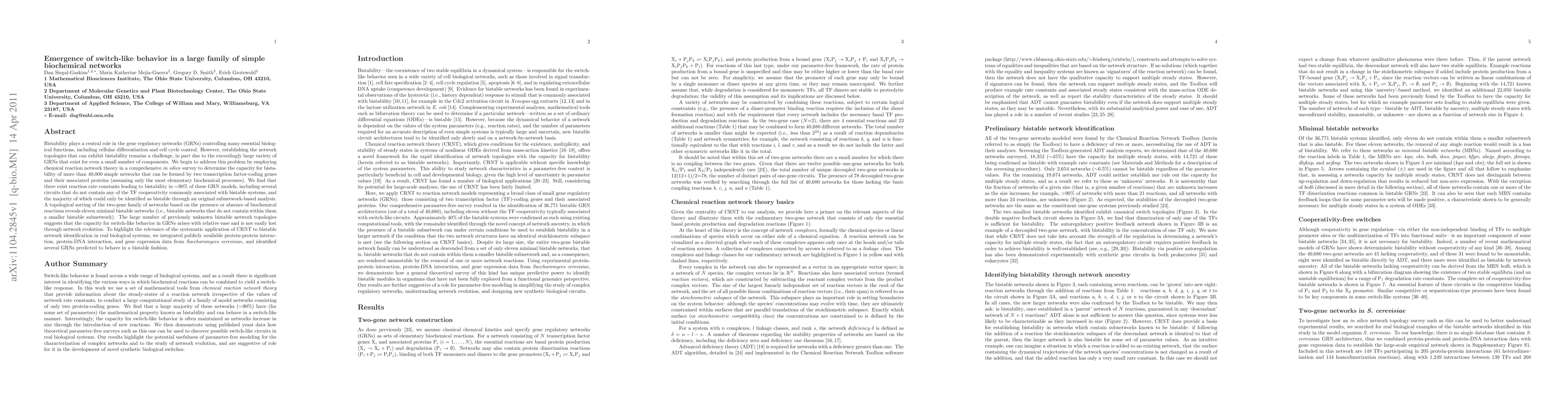 Bistability plays a central role in the gene regulatory networks (GRNs) controlling many essential biological functions, including cellular differentiation and cell cycle control. However, establishing the network topologies that can exhibit bistability remains a challenge, in part due to the exceedingly large variety of GRNs that exist for even a small number of components. We begin to address this problem by employing chemical reaction network theory in a comprehensive in silico survey to determine the capacity for bistability of more than 40,000 simple networks that can be formed by two transcription factor-coding genes and their associated proteins (assuming only the most elementary biochemical processes). We find that there exist reaction rate constants leading to bistability in ~90% of these GRN models, including several circuits that do not contain any of the TF cooperativity commonly associated with bistable systems, and the majority of which could only be identified as bistable through an original subnetwork-based analysis. A topological sorting of the two-gene family of networks based on the presence or absence of biochemical reactions reveals eleven minimal bistable networks (i.e., bistable networks that do not contain within them a smaller bistable subnetwork). The large number of previously unknown bistable network topologies suggests that the capacity for switch-like behavior in GRNs arises with relative ease and is not easily lost through network evolution. To highlight the relevance of the systematic application of CRNT to bistable network identification in real biological systems, we integrated publicly available protein-protein interaction, protein-DNA interaction, and gene expression data from Saccharomyces cerevisiae, and identified several GRNs predicted to behave in a bistable fashion.