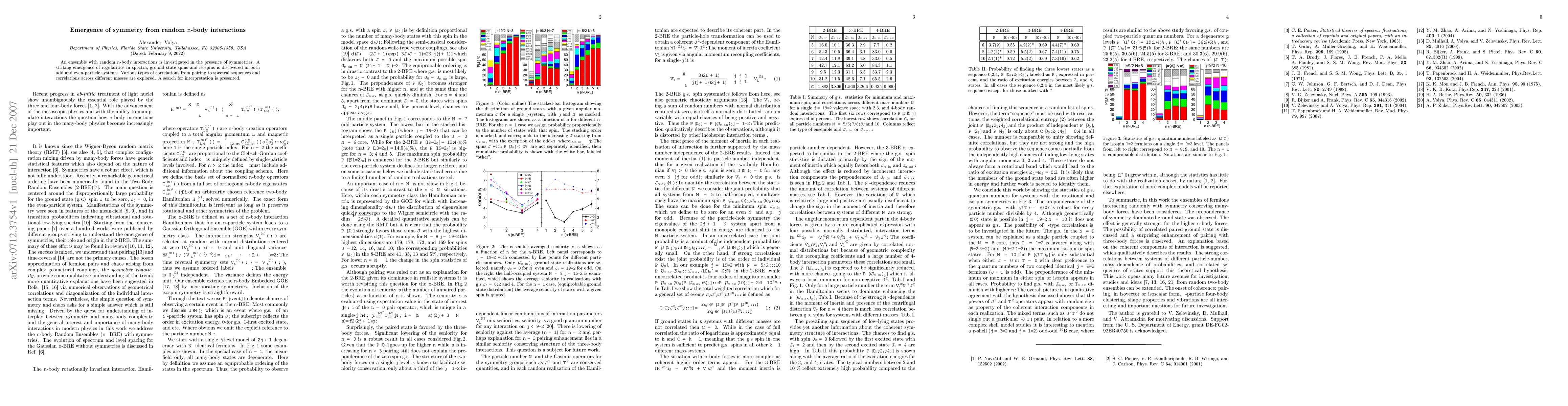 An ensemble with random n-body interactions is investigated in the presence of symmetries. A striking emergence of regularities in spectra, ground state spins and isospins is discovered in both odd and even-particle systems. Various types of correlations from pairing to spectral sequences and correlations across different masses are explored. A search for interpretation is presented.