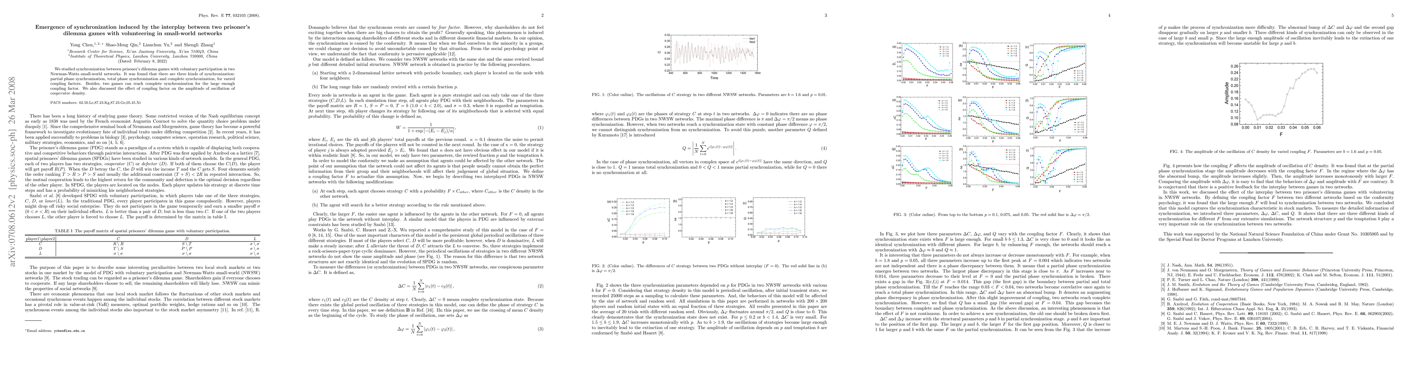 Summary: This study investigates synchronization in two prisoner's dilemma games on Newman-Watts small-world networks, revealing three types of synchronization depending on the coupling factor. Complete synchronization is achievable for sufficiently large coupling factors, and the coupling factor also influences the oscillation amplitude of cooperator density.