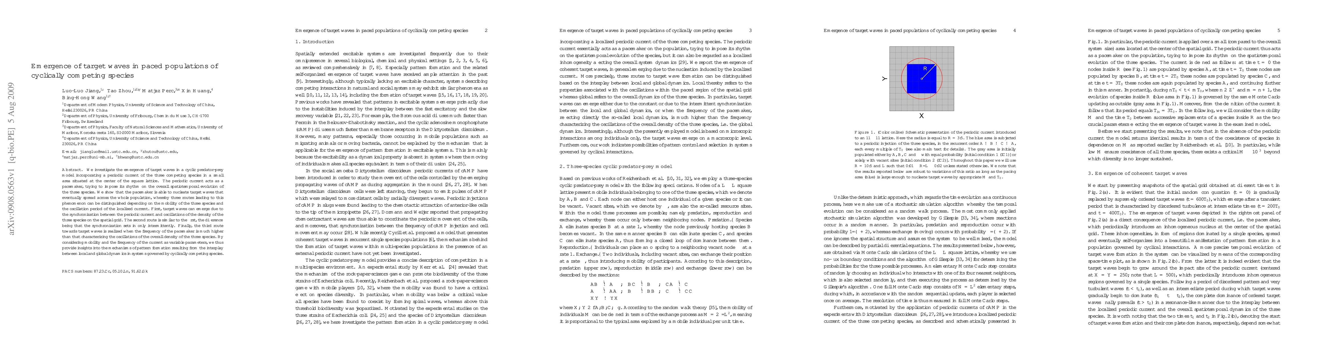 We investigate the emergence of target waves in a cyclic predator-prey model incorporating a periodic current of the three competing species in a small area situated at the center of the square lattice. The periodic current acts as a pacemaker, trying to impose its rhythm on the overall spatiotemporal evolution of the three species. We show that the pacemaker is able to nucleate target waves that eventually spread across the whole population, whereby three routes leading to this phenomenon can be distinguished depending on the mobility of the three species and the oscillation period of the localized current. First, target waves can emerge due to the synchronization between the periodic current and oscillations of the density of the three species on the spatial grid. The second route is similar to the first, the difference being that the synchronization sets in only intermittently. Finally, the third route towards target waves is realized when the frequency of the pacemaker is much higher than that characterizing the oscillations of the overall density of the three species. By considering mobility and the frequency of the current as variable parameters, we thus provide insights into the mechanisms of pattern formation resulting from the interplay between local and global dynamics in systems governed by cyclically competing species.