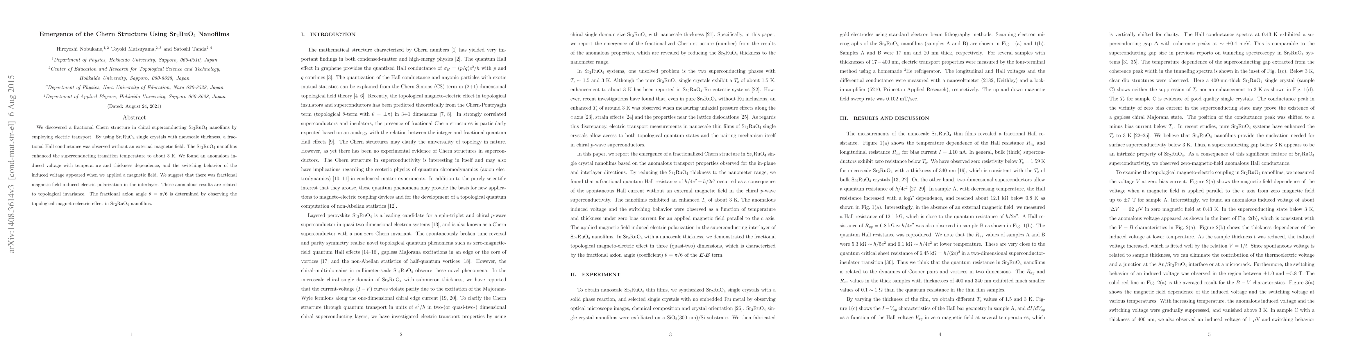 We discovered a fractional Chern structure in chiral superconducting Sr$_2$RuO$_4$ nanofilms by employing electric transport. By using Sr$_2$RuO$_4$ single crystals with nanoscale thickness, a fractional Hall conductance was observed without an external magnetic field. The Sr$_2$RuO$_4$ nanofilms enhanced the superconducting transition temperature to about 3 K. We found an anomalous induced voltage with temperature and thickness dependence, and the switching behavior of the induced voltage appeared when we applied a magnetic field. We suggest that there was fractional magnetic-field-induced electric polarization in the interlayer. These anomalous results are related to topological invariance. The fractional axion angle $\theta=\pi/6$ is determined by observing the topological magneto-electric effect in Sr$_2$RuO$_4$ nanofilms.