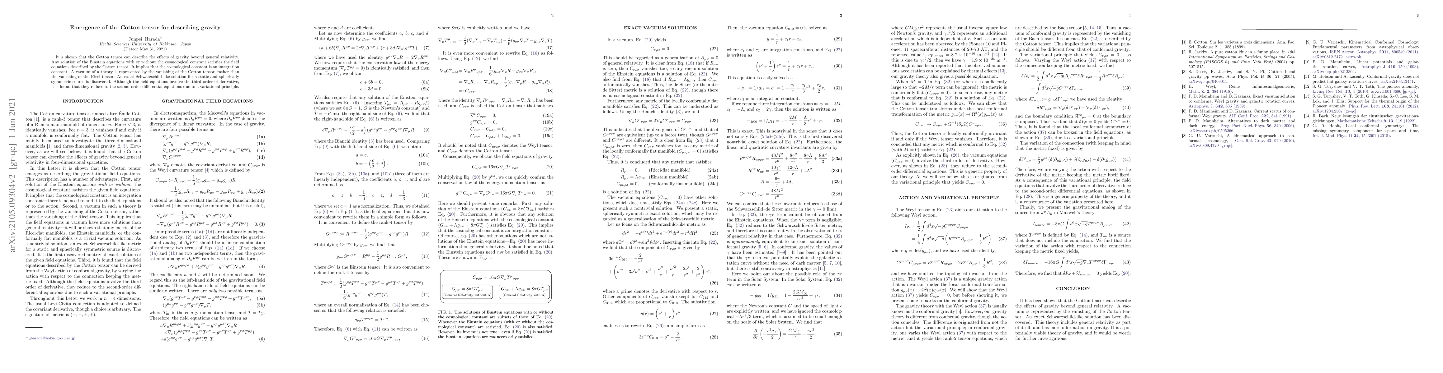 Summary: The Cotton tensor is introduced to describe gravity beyond general relativity, showing compatibility with Einstein equations, implying the cosmological constant as an integration constant, and revealing a Schwarzschild-like solution. The field equations, though third-order, effectively reduce to second-order equations through a variational principle.