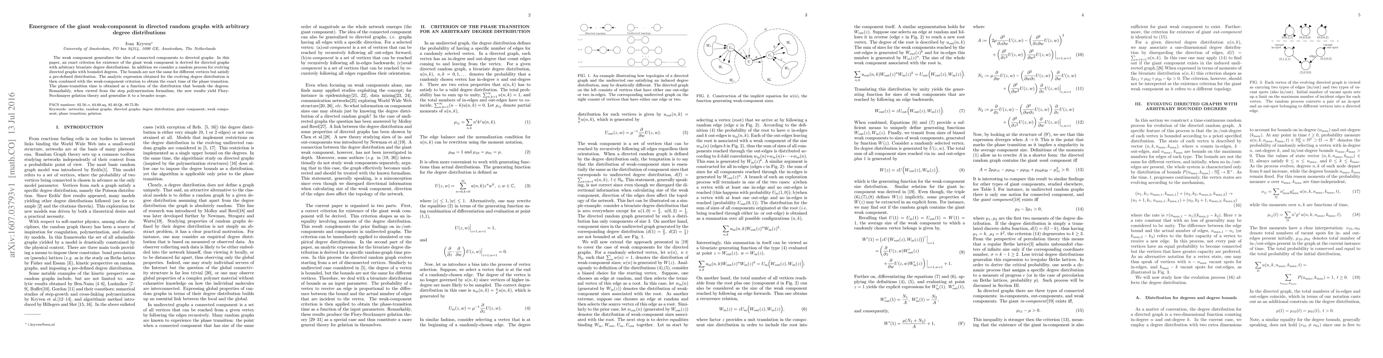 This paper derives an exact criterion for the emergence of the giant weak component in directed random graphs with arbitrary degree distributions. It also explores an evolving graph model with bounded, distribution-defined vertex degrees, determining the phase transition time and linking these findings to Flory-Stockmayer gelation theory.