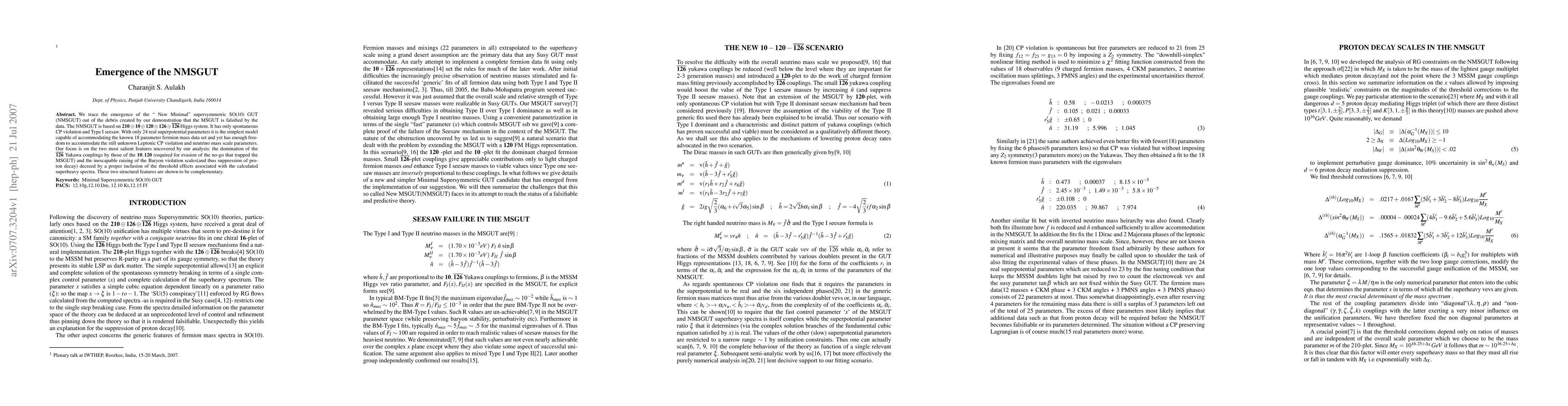 We trace the emergence of the ``New Minimal'' supersymmetric SO(10) GUT (NMSGUT) out of the debris created by our demonstration that the MSGUT is falsified by the data. The NMSGUT is based on ${\bf{210\oplus 10\oplus 120\oplus 126\oplus {\bar {126}}}}$ Higgs system. It has only spontaneous CP violation and Type I seesaw. With only 24 real superpotential parameters it is the simplest model capable of accommodating the known 18 parameter fermion mass data set and yet has enough freedom to accommodate the still unknown Leptonic CP violation and neutrino mass scale parameters. Our focus is on the two most salient features uncovered by our analysis: the domination of the ${\bf{\bar{126}}}$ Yukawa couplings by those of the ${\bf{10,120}}$ (required for evasion of the no-go that trapped the MSGUT) and the inescapable raising of the Baryon violation scales(and thus suppression of proton decay) decreed by a proper inclusion of the threshold effects associated with the calculated superheavy spectra. These two structural features are shown to be complementary.