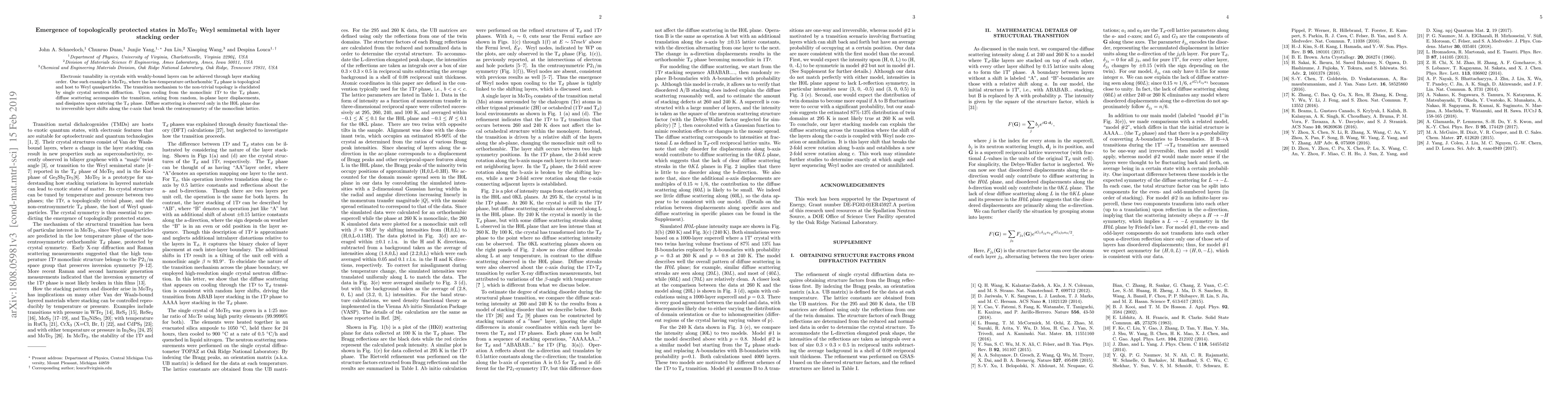 This paper investigates the emergence of topologically protected states in MoTe$_2$ Weyl semimetals through layer stacking order changes. Single crystal neutron diffraction reveals that the transition from monoclinic 1T$\prime$ to orthorhombic T$_d$ phase involves diffuse scattering due to in-plane layer displacements, which disappear upon entering the topological T$_d$ phase.
