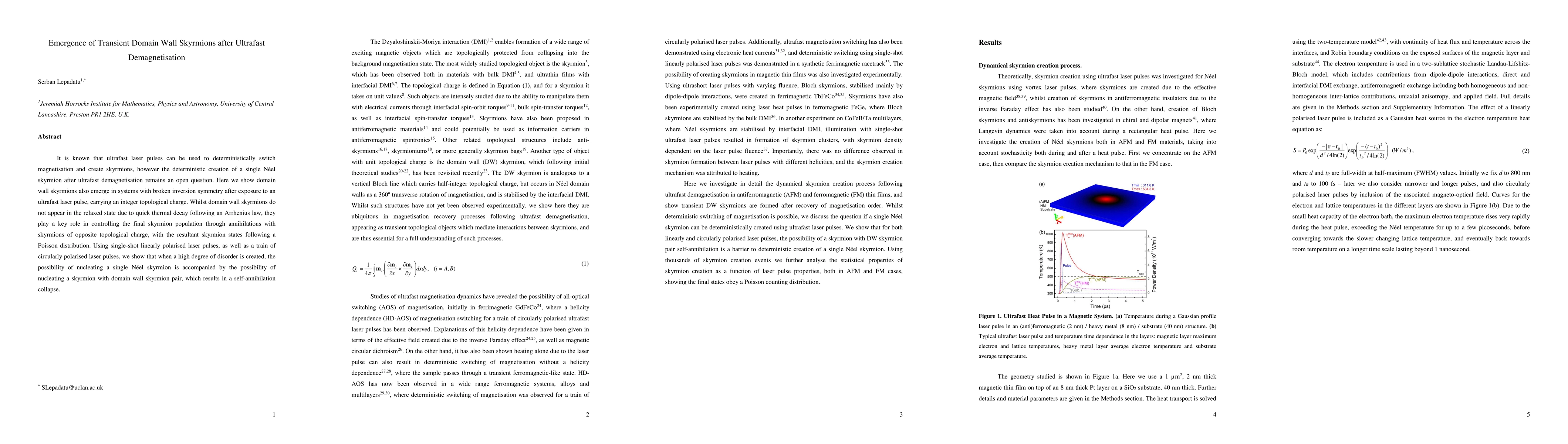 This research demonstrates the emergence of transient domain wall skyrmions following ultrafast laser demagnetisation in systems with broken inversion symmetry, showing they carry an integer topological charge. These transient skyrmions play a crucial role in controlling the final skyrmion population via annihilations, leading to a Poisson distribution of resultant skyrmions.