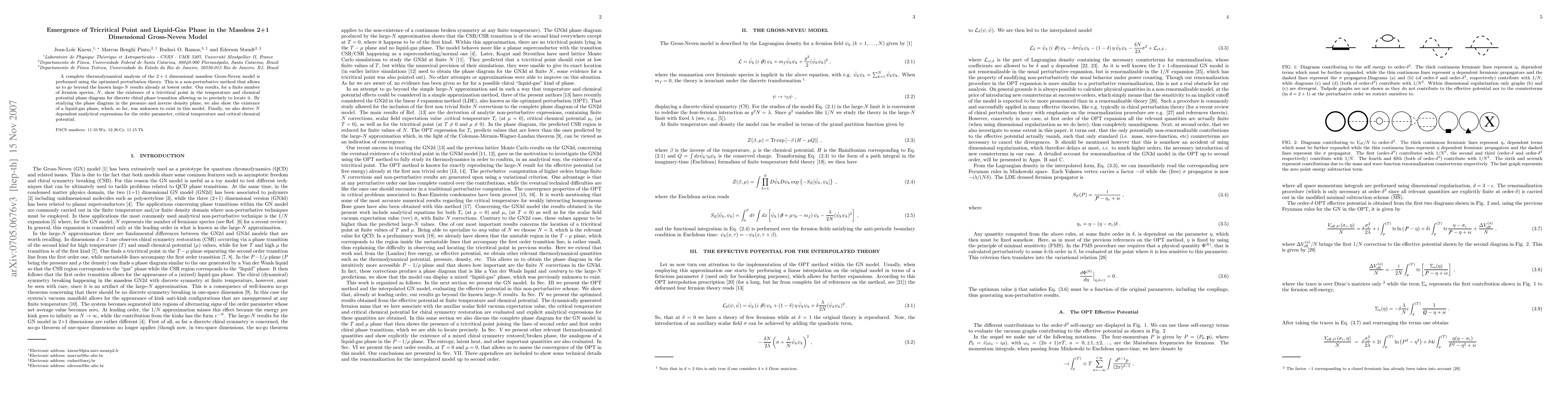 This paper uses optimized perturbation theory to analyze the 2+1 dimensional massless Gross-Neveu model, revealing a tricritical point and a previously unknown liquid-gas phase in the model's phase diagram. The study also provides N-dependent analytical expressions for key thermodynamic quantities.