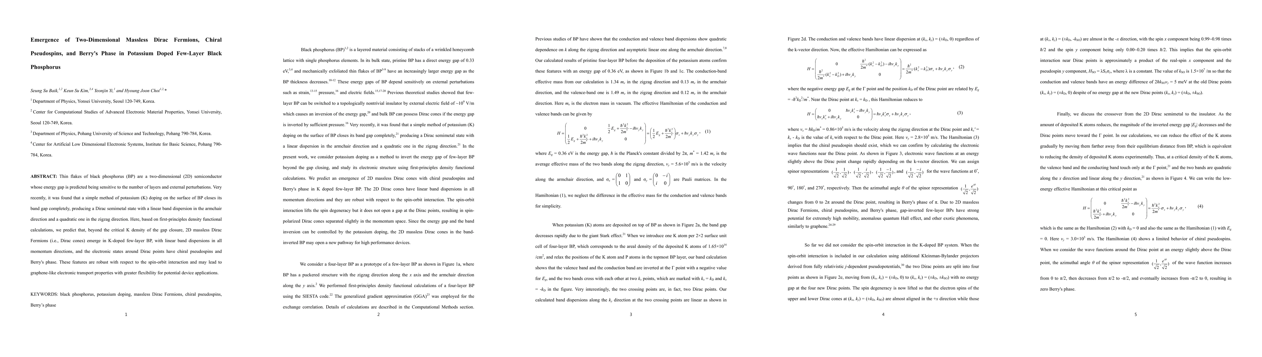 Research reveals the emergence of 2D massless Dirac fermions, chiral pseudospins, and Berry's phase in potassium-doped few-layer black phosphorus. These findings suggest potential graphene-like electronic transport properties and flexibility for device applications.