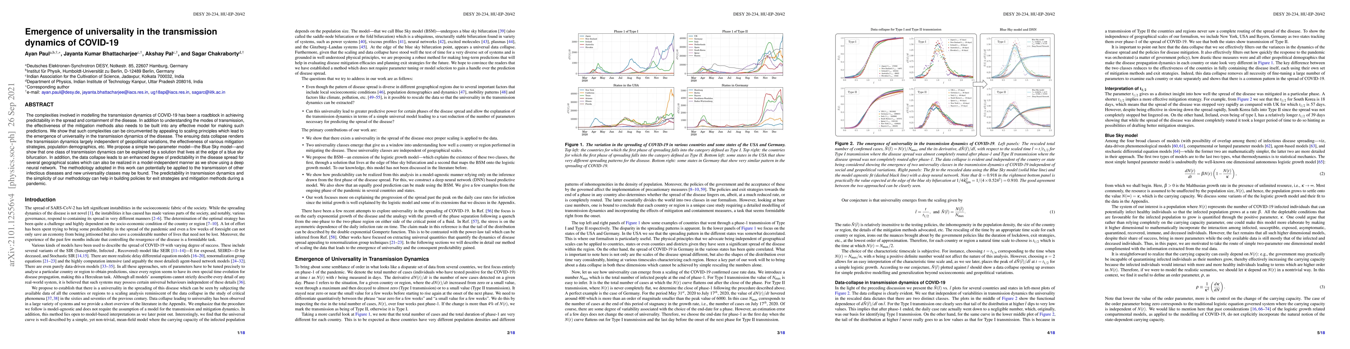 The complexities involved in modelling the transmission dynamics of COVID-19 has been a roadblock in achieving predictability in the spread and containment of the disease. In addition to understanding the modes of transmission, the effectiveness of the mitigation methods also needs to be built into any effective model for making such predictions. We show that such complexities can be circumvented by appealing to scaling principles which lead to the emergence of universality in the transmission dynamics of the disease. The ensuing data collapse renders the transmission dynamics largely independent of geopolitical variations, the effectiveness of various mitigation strategies, population demographics, etc. We propose a simple two-parameter model -- the Blue Sky model -- and show that one class of transmission dynamics can be explained by a solution that lives at the edge of a blue sky bifurcation. In addition, the data collapse leads to an enhanced degree of predictability in the disease spread for several geographical scales which can also be realized in a model-independent manner as we show using a deep neural network. The methodology adopted in this work can potentially be applied to the transmission of other infectious diseases and new universality classes may be found. The predictability in transmission dynamics and the simplicity of our methodology can help in building policies for exit strategies and mitigation methods during a pandemic.