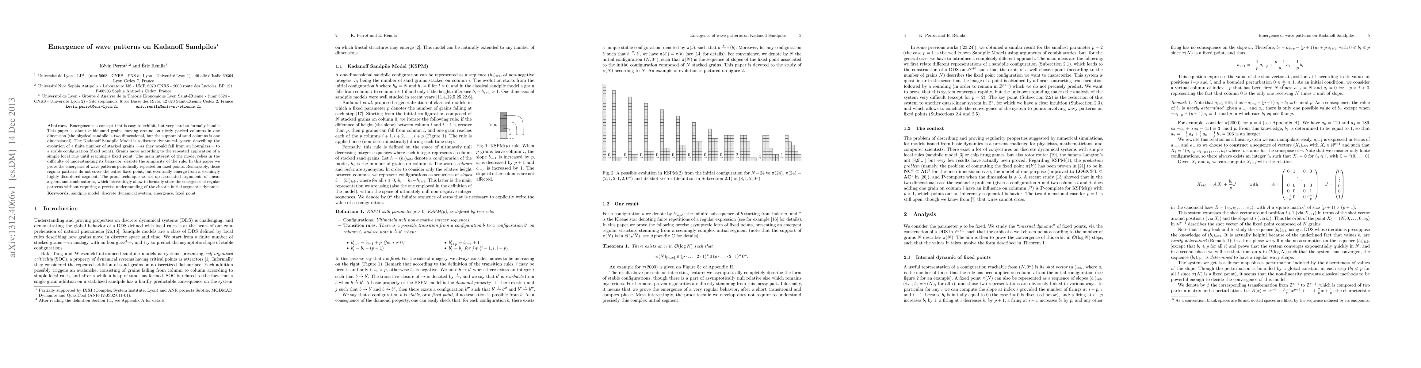 Emergence is a concept that is easy to exhibit, but very hard to formally handle. This paper is about cubic sand grains moving around on nicely packed columns in one dimension (the physical sandpile is two dimensional, but the support of sand columns is one dimensional). The Kadanoff Sandpile Model is a discrete dynamical system describing the evolution of a finite number of stacked grains --as they would fall from an hourglass-- to a stable configuration (fixed point). Grains move according to the repeated application of a simple local rule until reaching a fixed point. The main interest of the model relies in the difficulty of understanding its behavior, despite the simplicity of the rule. In this paper we prove the emergence of wave patterns periodically repeated on fixed points. Remarkably, those regular patterns do not cover the entire fixed point, but eventually emerge from a seemingly highly disordered segment. The proof technique we set up associates arguments of linear algebra and combinatorics, which interestingly allow to formally state the emergence of regular patterns without requiring a precise understanding of the chaotic initial segment's dynamic.