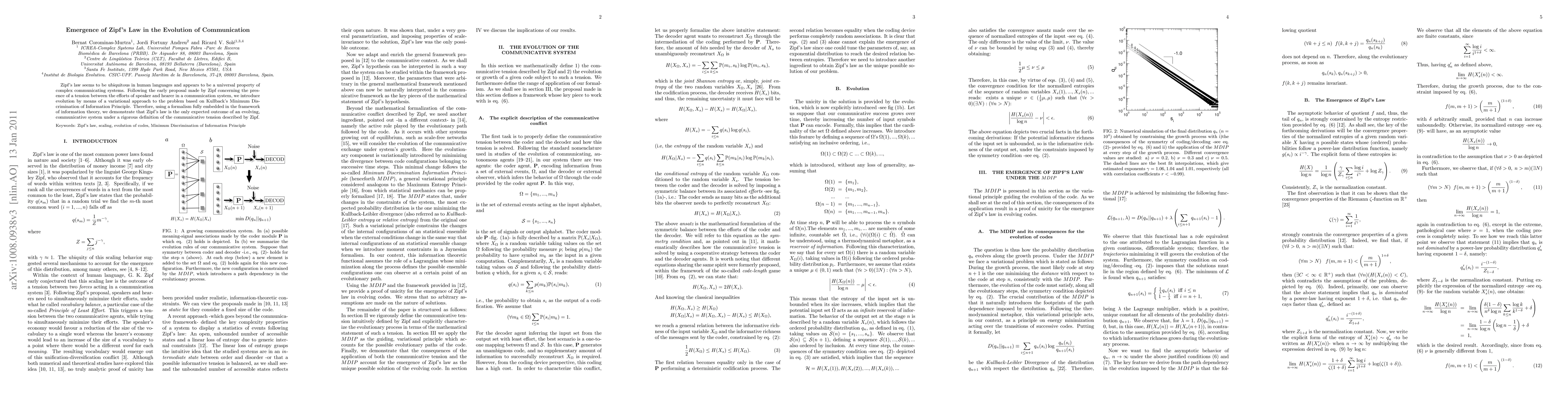 Summary: This paper demonstrates that Zipf's law emerges naturally in evolving communication systems through a variational approach based on Kullback's Minimum Discrimination of Information Principle, showing that it is the result of the inherent tension between speakers and listeners. The findings underscore Zipf's law as a universal property of complex communication systems.