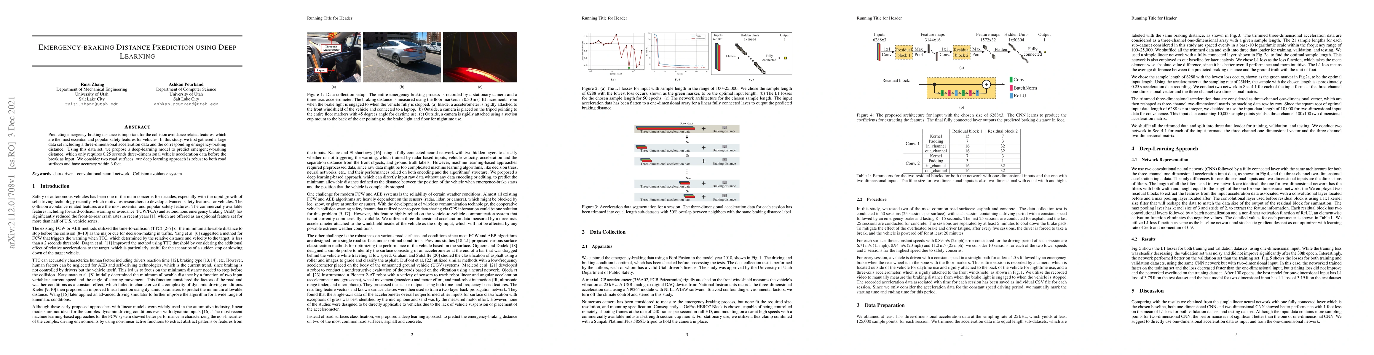 This paper proposes a deep-learning model to predict emergency-braking distance using 0.25 seconds of three-dimensional vehicle acceleration data, achieving accuracy within 3 feet on two different road surfaces. The model is designed for collision avoidance features in vehicles.