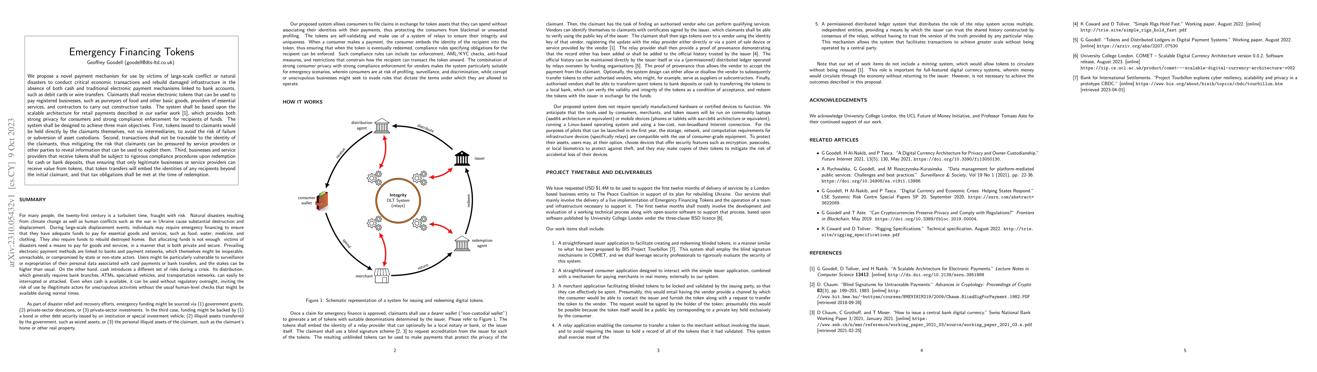 We propose a novel payment mechanism for use by victims of large-scale conflict or natural disasters to conduct critical economic transactions and rebuild damaged infrastructure in the absence of both cash and traditional electronic payment mechanisms linked to bank accounts, such as debit cards or wire transfers. Claimants shall receive electronic tokens that can be used to pay registered businesses, such as purveyors of food and other basic goods, providers of essential services, and contractors to carry out construction tasks. The system shall be based upon the scalable architecture for retail payments described in our earlier work, which provides both strong privacy for consumers and strong compliance enforcement for recipients of funds. The system shall be designed to achieve three main objectives. First, tokens issued to claimants would be held directly by the claimants themselves, not via intermediaries, to avoid the risk of failure or subversion of asset custodians. Second, transactions shall not be traceable to the identity of the claimants, thus mitigating the risk that claimants can be pressured by service providers or other parties to reveal information that can be used to exploit them. Third, businesses and service providers that receive tokens shall be subject to rigorous compliance procedures upon redemption for cash or bank deposits, thus ensuring that only legitimate businesses or service providers can receive value from tokens, that token transfers will embed the identities of any recipients beyond the initial claimant, and that tax obligations shall be met at the time of redemption.