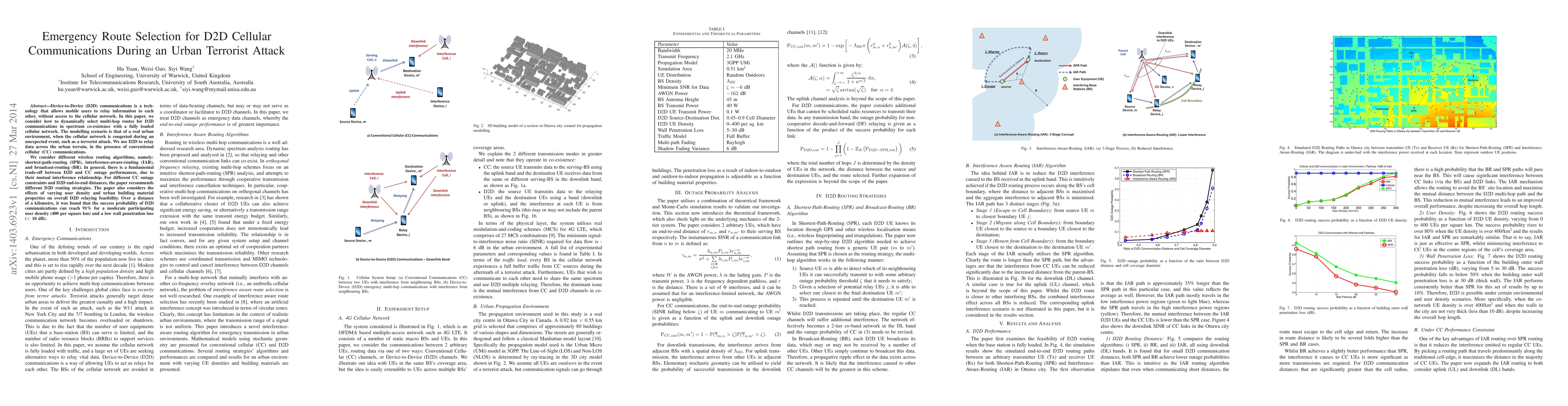 This paper explores dynamic multi-hop route selection for Device-to-Device (D2D) communications during urban terrorist attacks, where cellular networks are congested. It evaluates routing algorithms like shortest-path-routing, interference-aware-routing, and broadcast-routing, highlighting the trade-off between D2D and conventional cellular communications, and finds a 91% success probability for D2D relaying over a kilometre under moderate user density and low wall penetration loss.