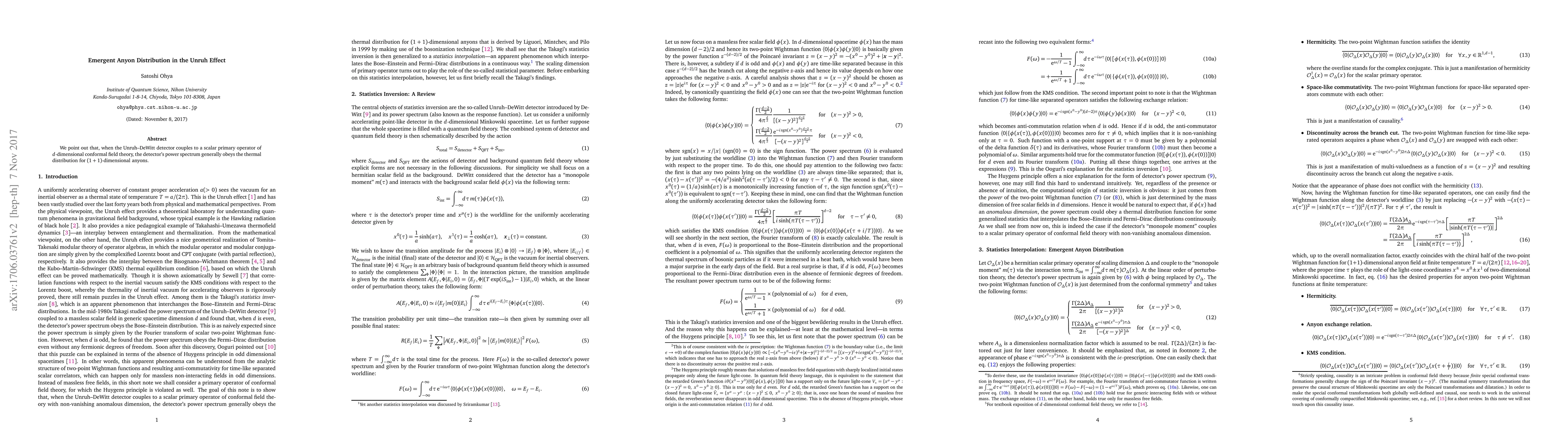 Summary: The Unruh-DeWitt detector interacting with a scalar primary operator in a $d$-dimensional conformal field theory exhibits a power spectrum that follows the thermal distribution for $(1+1)$-dimensional anyons, revealing emergent anyon behavior in the Unruh effect.