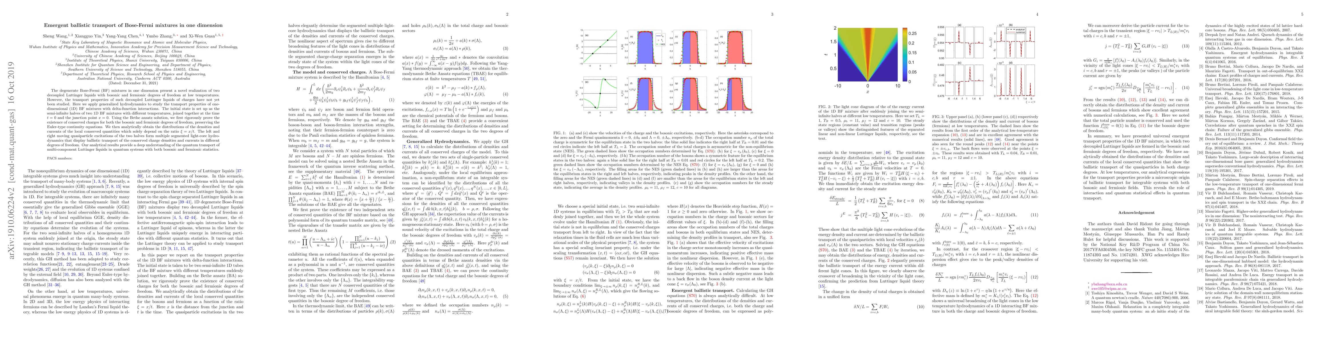 The degenerate Bose-Fermi (BF) mixtures in one dimension present a novel realization of two decoupled Luttinger liquids with bosonic and fermionic degrees of freedom at low temperatures. However, the transport properties of such decoupled Luttinger liquids of charges have not yet been studied. Here we apply generalized hydrodynamics to study the transport properties of one-dimensional (1D) BF mixtures with delta-function interactions. The initial state is set up as the semi-infinite halves of two 1D BF mixtures with different temperatures, joined together at the time $t=0$ and the junction point $x=0$. Using the Bethe ansatz solution, we first rigorously prove the existence of conserved charges for both the bosonic and fermionic degrees of freedom, preserving the Euler-type continuity equations. We then analytically obtain the distributions of the densities and currents of the local conserved quantities which solely depend on the ratio $\xi=x/t$. The left and right moving quasiparticle excitations of the two halves form multiple segmented light-cone hydrodynamics that display ballistic transport of the conserved charge densities and currents in different degrees of freedom. Our analytical results provide a deep understanding of the quantum transport of multi-component Luttinger liquids in quantum systems with both bosonic and fermionic statistics.