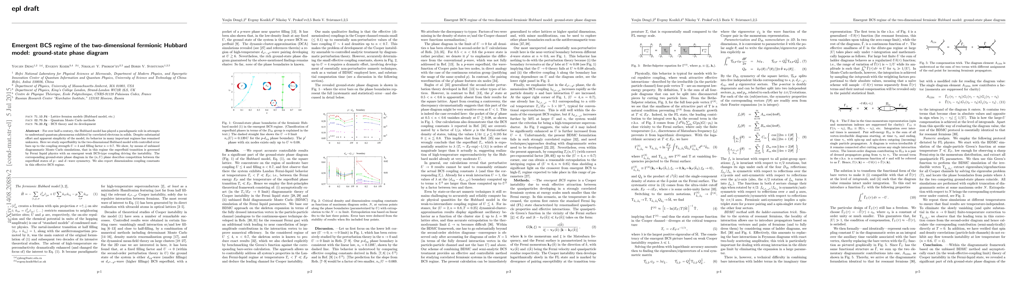 A significant part of the phase diagram of the two-dimensional fermionic Hubbard model for moderate interactions and filling factors ($U < 4, \, n<0.7$) is governed by effective Fermi liquid physics with weak BCS-type instabilities. We access this regime in a controlled way by a combination of the bold-line diagrammatic Monte Carlo method with an additional ladder-diagram summation trick and semi-analytic treatment of the weak instability in the Cooper channel. We obtain the corresponding ground-state phase diagram in the $(n,U)$ plane describing the competition between the $p-$ and $d-$wave superfluid states. We also claim the values of the dimensionless BCS coupling constants controlling the superfluid $T_c$ at the phase boundaries, which prove to be very small up to $U=4, n = 0.6$.
