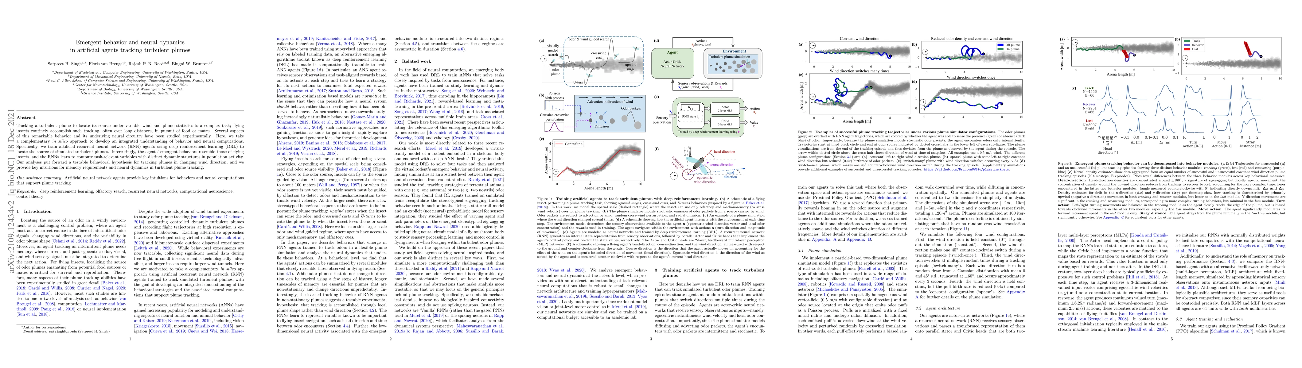 Tracking a turbulent plume to locate its source is a complex control problem because it requires multi-sensory integration and must be robust to intermittent odors, changing wind direction, and variable plume statistics. This task is routinely performed by flying insects, often over long distances, in pursuit of food or mates. Several aspects of this remarkable behavior have been studied in detail in many experimental studies. Here, we take a complementary in silico approach, using artificial agents trained with reinforcement learning to develop an integrated understanding of the behaviors and neural computations that support plume tracking. Specifically, we use deep reinforcement learning (DRL) to train recurrent neural network (RNN) agents to locate the source of simulated turbulent plumes. Interestingly, the agents' emergent behaviors resemble those of flying insects, and the RNNs learn to represent task-relevant variables, such as head direction and time since last odor encounter. Our analyses suggest an intriguing experimentally testable hypothesis for tracking plumes in changing wind direction -- that agents follow local plume shape rather than the current wind direction. While reflexive short-memory behaviors are sufficient for tracking plumes in constant wind, longer timescales of memory are essential for tracking plumes that switch direction. At the level of neural dynamics, the RNNs' population activity is low-dimensional and organized into distinct dynamical structures, with some correspondence to behavioral modules. Our in silico approach provides key intuitions for turbulent plume tracking strategies and motivates future targeted experimental and theoretical developments.