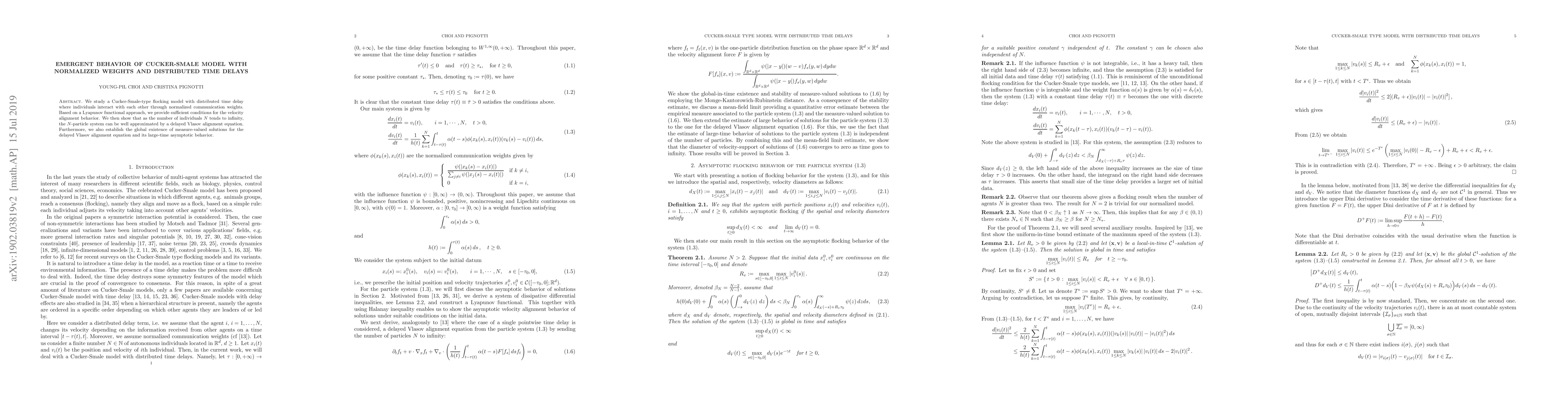 This paper investigates a Cucker-Smale flocking model with distributed time delays and normalized communication weights, proving conditions for velocity alignment using a Lyapunov functional approach. It also demonstrates that the system approximates a delayed Vlasov alignment equation as the number of individuals approaches infinity, establishing global existence and asymptotic behavior of measure-valued solutions.