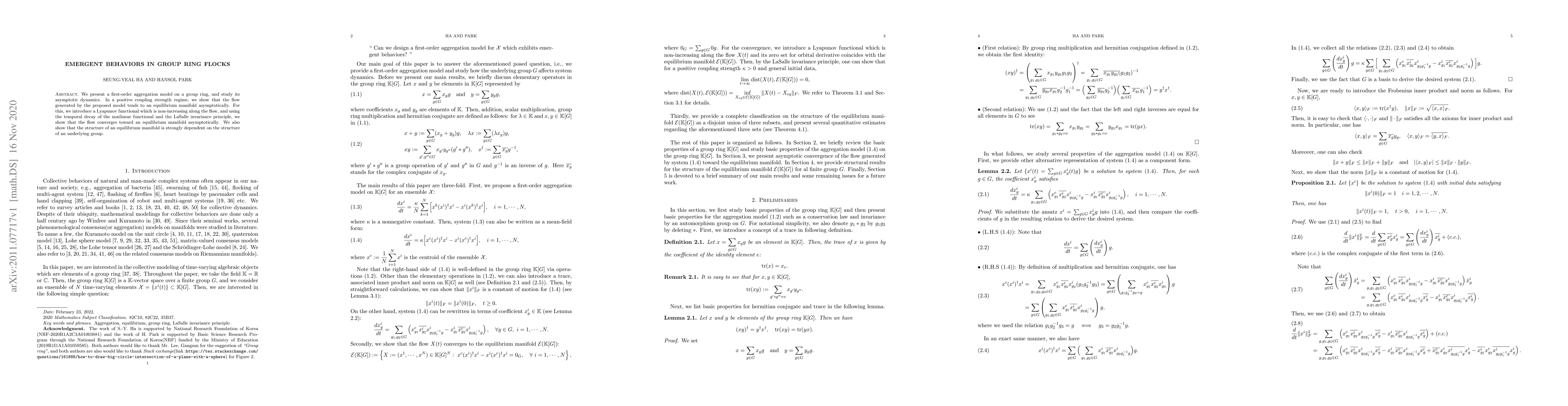 We present a first-order aggregation model on a group ring, and study its asymptotic dynamics. In a positive coupling strength regime, we show that the flow generated by the proposed model tends to an equilibrium manifold asymptotically. For this, we introduce a Lyapunov functional which is non-increasing along the flow, and using the temporal decay of the nonlinear functional and the LaSalle invariance principle, we show that the flow converges toward an equilibrium manifold asymptotically. We also show that the structure of an equilibrium manifold is strongly dependent on the structure of an underlying group.