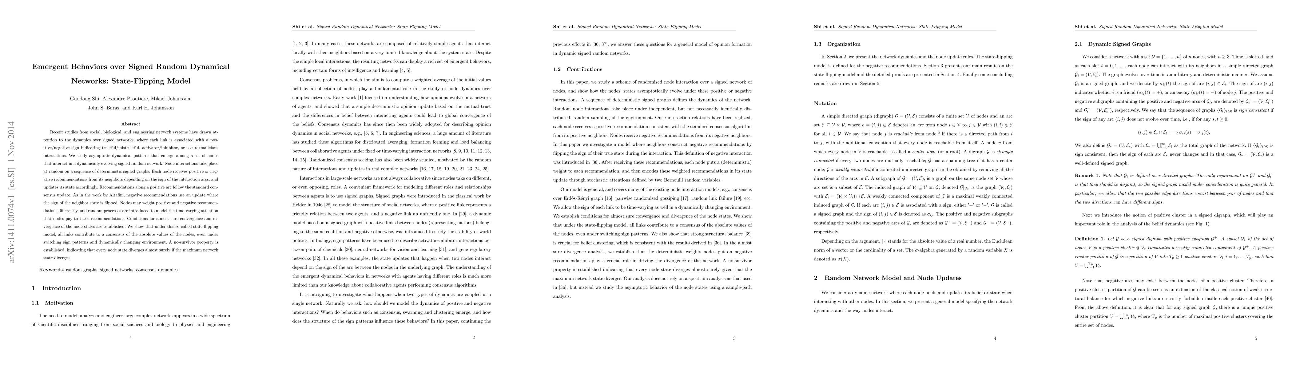 A new model for signed random dynamical networks predicts that nodes converge to absolute values under certain conditions, even with changing sign patterns and environments. The study establishes a key property called the no-survivor property, indicating that diverging node states occur if maximum network state diverges.