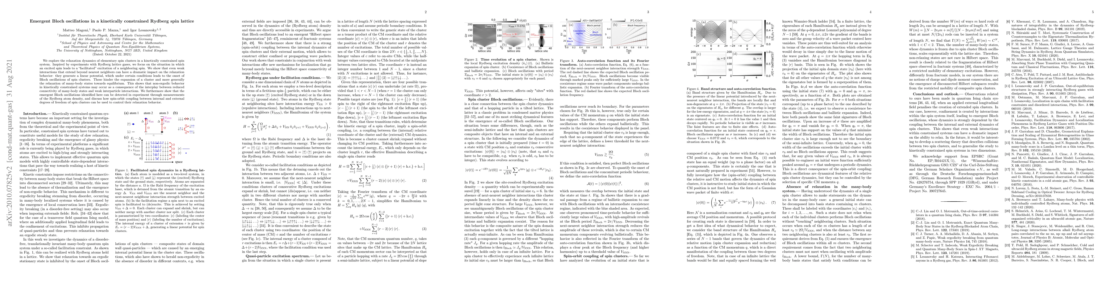 This paper investigates the relaxation dynamics in a kinetically constrained Rydberg spin lattice, revealing that weak, extended interactions can induce emergent Bloch oscillations, hindering cluster expansion and relaxation. These oscillations can be detected experimentally via Rydberg atom density measurements and manipulated through spin-orbit coupling.