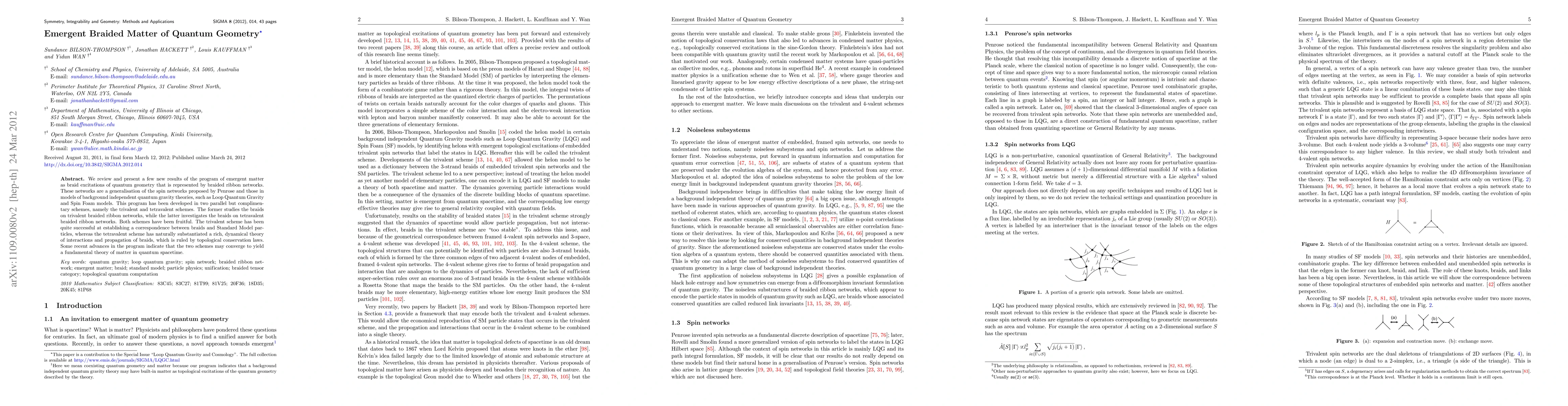 We review and present a few new results of the program of emergent matter as braid excitations of quantum geometry that is represented by braided ribbon networks. These networks are a generalisation of the spin networks proposed by Penrose and those in models of background independent quantum gravity theories, such as Loop Quantum Gravity and Spin Foam models. This program has been developed in two parallel but complimentary schemes, namely the trivalent and tetravalent schemes. The former studies the braids on trivalent braided ribbon networks, while the latter investigates the braids on tetravalent braided ribbon networks. Both schemes have been fruitful. The trivalent scheme has been quite successful at establishing a correspondence between braids and Standard Model particles, whereas the tetravalent scheme has naturally substantiated a rich, dynamical theory of interactions and propagation of braids, which is ruled by topological conservation laws. Some recent advances in the program indicate that the two schemes may converge to yield a fundamental theory of matter in quantum spacetime.
