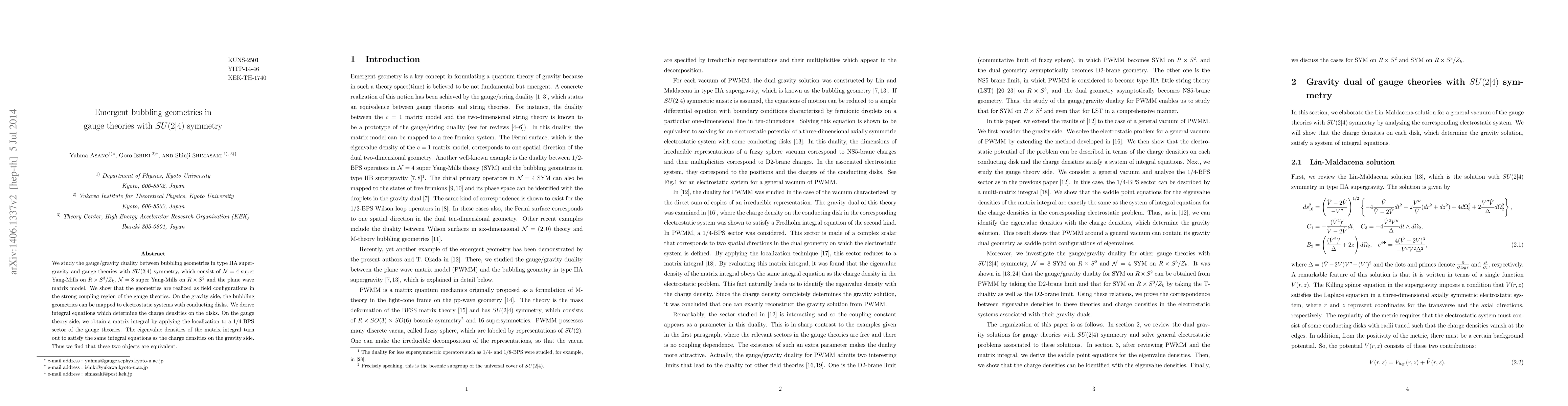 This paper explores the gauge/gravity duality between bubbling geometries in type IIA supergravity and gauge theories with SU(2|4) symmetry, showing that these geometries correspond to field configurations in strong coupling gauge theories. The study reveals an equivalence between charge densities in the gravity side and eigenvalue densities in the gauge theory side via derived integral equations.