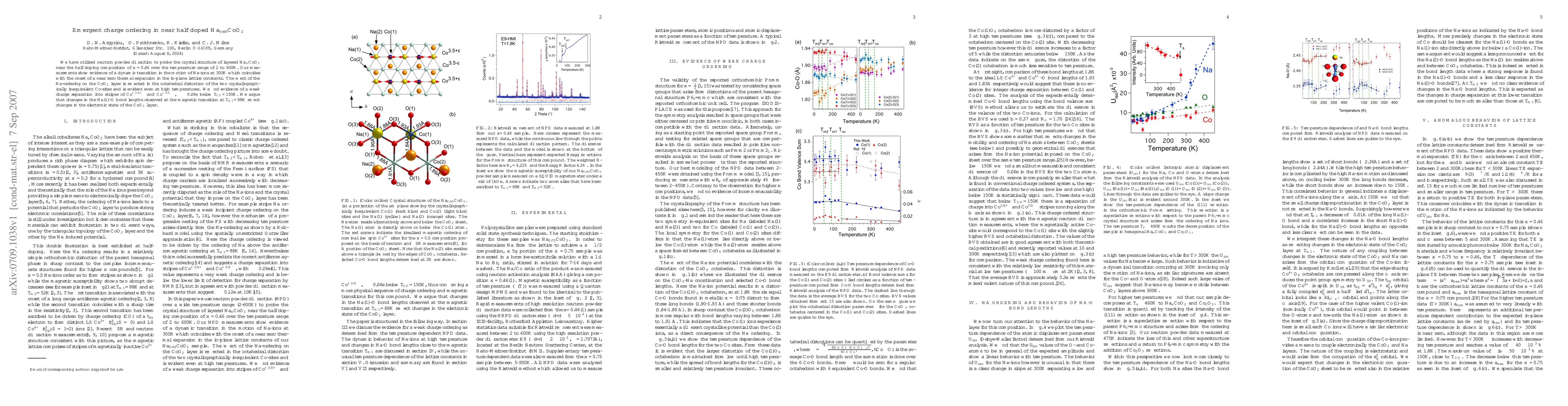 We have utilized neutron powder diffraction to probe the crystal structure of layered Na$_{x}$CoO$_{2}$ near the half doping composition of $x=$0.46 over the temperature range of 2 to 600K. Our measurements show evidence of a dynamic transition in the motion of Na-ions at 300K which coincides with the onset of a near zero thermal expansion in the in-plane lattice constants. The effect of the Na-ordering on the CoO$_{2}$ layer is reflected in the octahedral distortion of the two crystallographically inequivalent Co-sites and is evident even at high temperatures. We find evidence of a weak charge separation into stripes of Co$^{+3.5+\epsilon}$ and Co$^{+3.5-\epsilon}$, $\epsilon\sim0.06e$ below \Tco=150K. We argue that changes in the Na(1)-O bond lengths observed at the magnetic transition at \tm=88K reflect changes in the electronic state of the CoO$_{2}$ layer