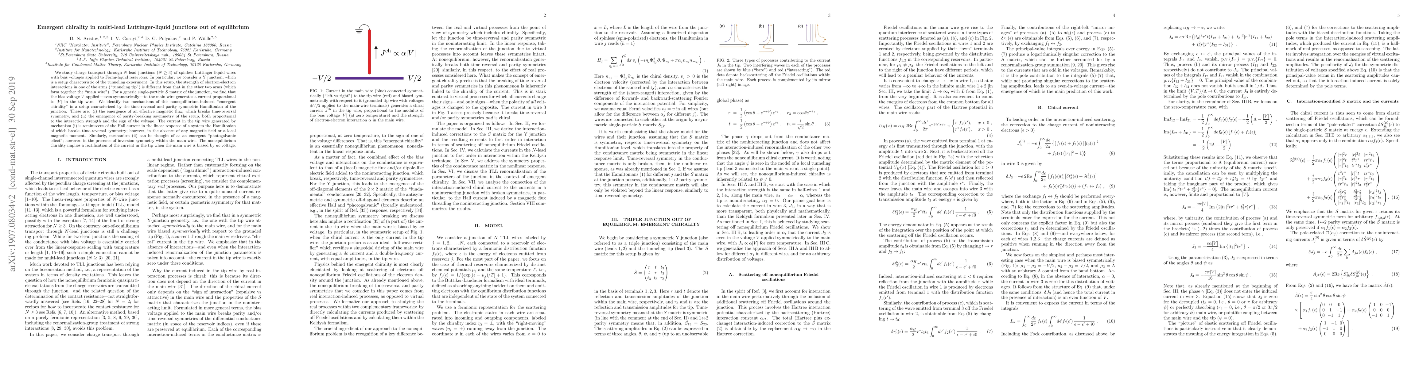 We study charge transport through $N$-lead junctions ($N\geq 3$) of spinless Luttinger liquid wires with bias voltages applied to Fermi-liquid reservoirs. In particular, we consider a Y junction, which is a setup characteristic of the tunneling experiment. In this setup, the strength of electron-electron interactions in one of the arms ("tunneling tip") is different from that in the other two arms (which form together the "main wire"). For a generic single-particle $S$ matrix of the junction, we find that the bias voltage $V$ applied---even symmetrically---to the main wire generates a current proportional to $|V|$ in the tip wire. We identify two mechanisms of this nonequilibrium-induced "emergent chirality" in a setup characterized by the time-reversal and parity symmetric Hamiltonian of the junction. These are: (i) the emergence of an effective magnetic flux, which breaks time-reversal symmetry, and (ii) the emergence of parity-breaking asymmetry of the setup, both proportional to the interaction strength and the sign of the voltage. The current in the tip wire generated by mechanism (i) is reminiscent of the Hall current in the linear response of a system the Hamiltonian of which breaks time-reversal symmetry; however, in the absence of any magnetic field or a local magnetic moment. Similarly, mechanism (ii) can be thought of as an emergent "photogalvanic effect"; however, in the presence of inversion symmetry within the main wire. The nonequilibrium chirality implies a rectification of the current in the tip when the main wire is biased by $\it ac$ voltage.