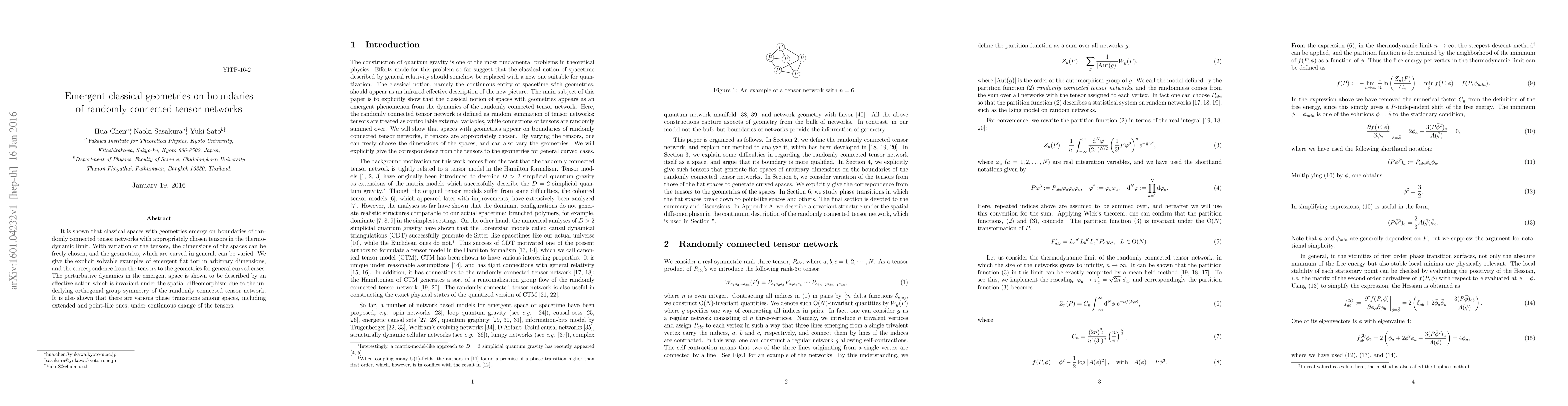 It is shown that classical spaces with geometries emerge on boundaries of randomly connected tensor networks with appropriately chosen tensors in the thermodynamic limit. With variation of the tensors, the dimensions of the spaces can be freely chosen, and the geometries, which are curved in general, can be varied. We give the explicit solvable examples of emergent flat tori in arbitrary dimensions, and the correspondence from the tensors to the geometries for general curved cases. The perturbative dynamics in the emergent space is shown to be described by an effective action which is invariant under the spatial diffeomorphism due to the underlying orthogonal group symmetry of the randomly connected tensor network. It is also shown that there are various phase transitions among spaces, including extended and point-like ones, under continuous change of the tensors.