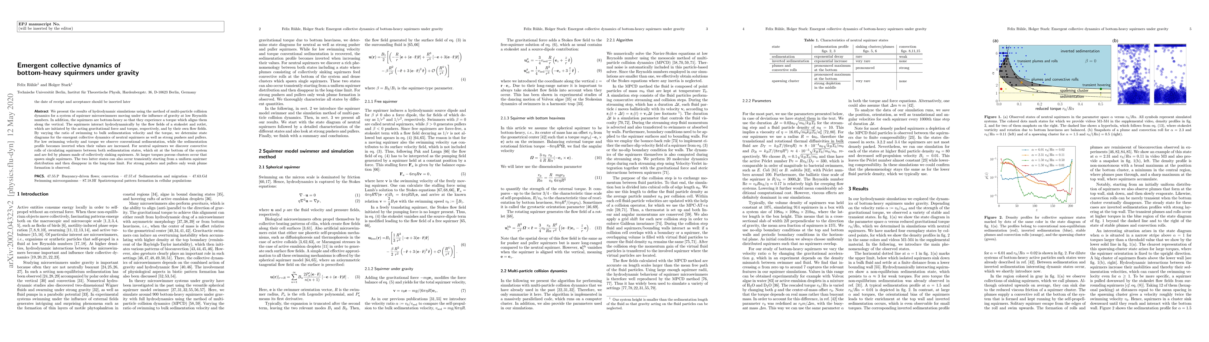 We present the results of hydrodynamic simulations using the method of multi-particle collision dynamics for a system of squirmer microswimmers moving under the influence of gravity at low Reynolds numbers. In addition, the squirmers are bottom-heavy so that they experience a torque which aligns them along the vertical. The squirmers interact hydrodynamically by the flow fields of a stokeslet and rotlet, which are initiated by the acting gravitational force and torque, respectively, and by their own flow fields. By varying the ratio of swimming to bulk sedimentation velocity and the torque, we determine state diagrams for the emergent collective dynamics of neutral squirmers as well as strong pushers and pullers. For low swimming velocity and torque we observe conventional sedimentation, while the sedimentation profile becomes inverted when their values are increased. For neutral squirmers we discover convective rolls of circulating squirmers between both sedimentation states, which sit at the bottom of the system and are fed by plumes made of collectively sinking squirmers. At larger torques porous clusters occur that spawn single squirmers. The two latter states can also occur transiently starting from a uniform squirmer distribution and then disappear in the long-time limit. For strong pushers and pullers only weak plume formation is observed.