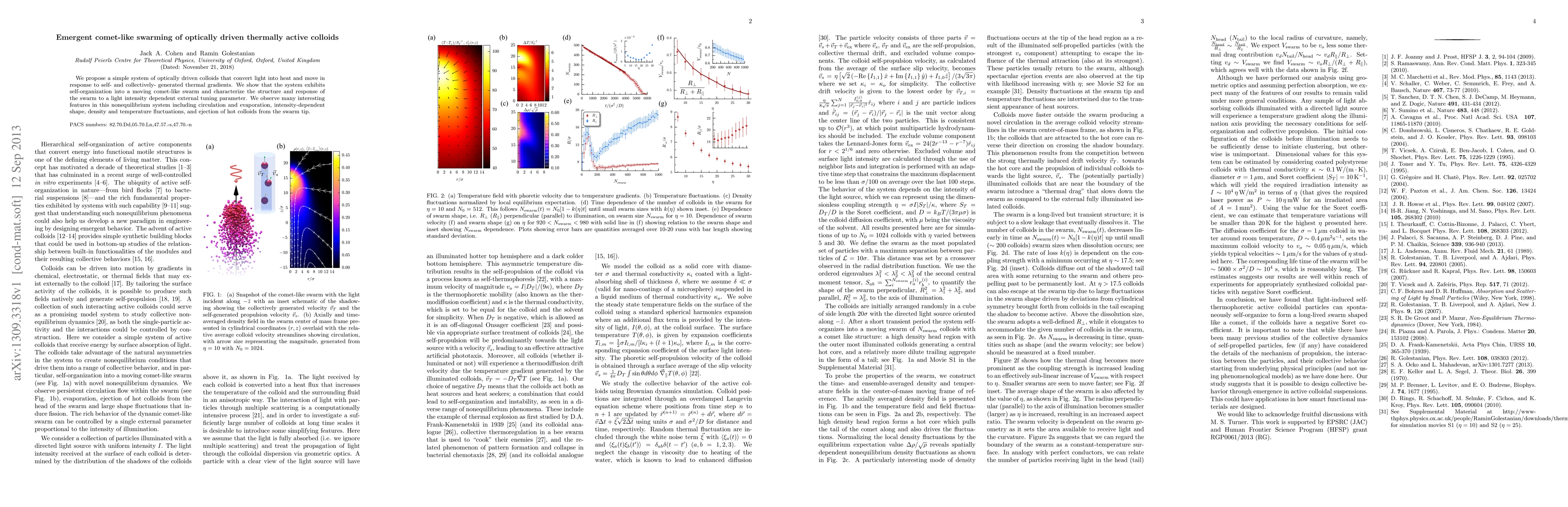 This paper investigates a system of optically driven colloids that convert light into heat, demonstrating self-organization into a comet-like swarming pattern. The study characterizes the emergent dynamics, including circulation, evaporation, and intensity-dependent shape and fluctuations, revealing complex behaviors in a nonequilibrium thermal system.