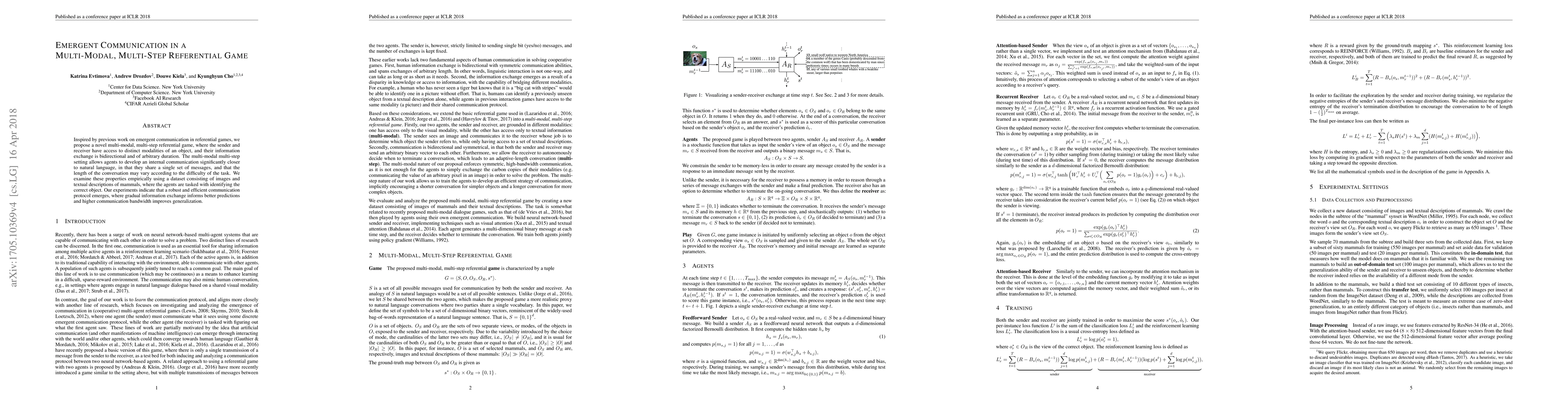This research explores a multi-modal, multi-step referential game to study emergent communication, finding that agents develop a shared communication protocol resembling natural language. Experiments using a dataset of mammal images and descriptions show that gradual information exchange enhances prediction accuracy and better communication leads to improved generalization.