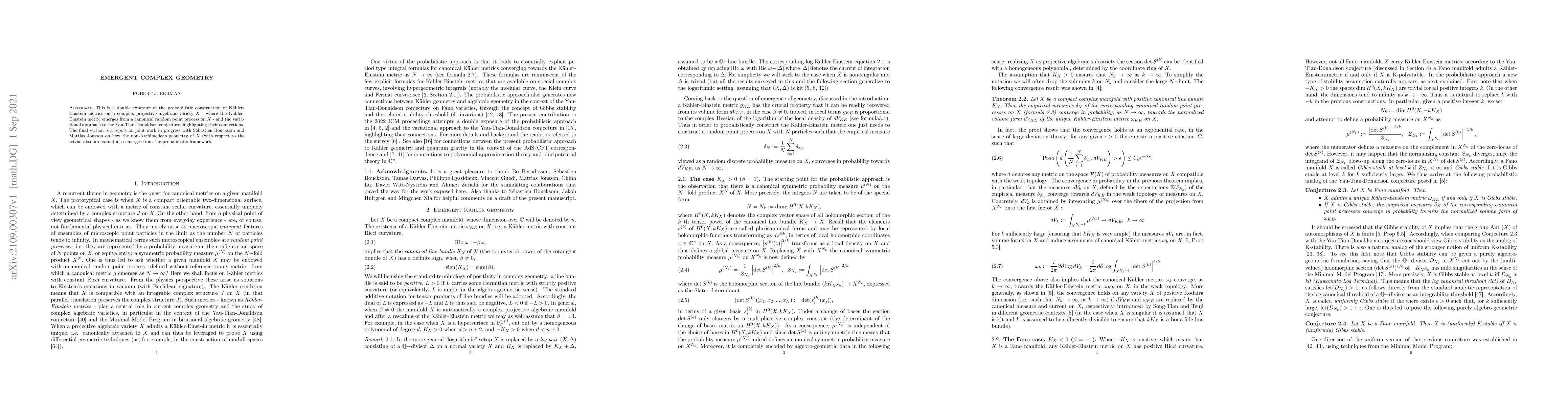 This paper explores the probabilistic construction of Kahler-Einstein metrics on complex projective algebraic varieties through a random point process and connects it to the Yau-Tian-Donaldson conjecture. It also discusses ongoing work on the emergent non-Archimedean geometry of these varieties.