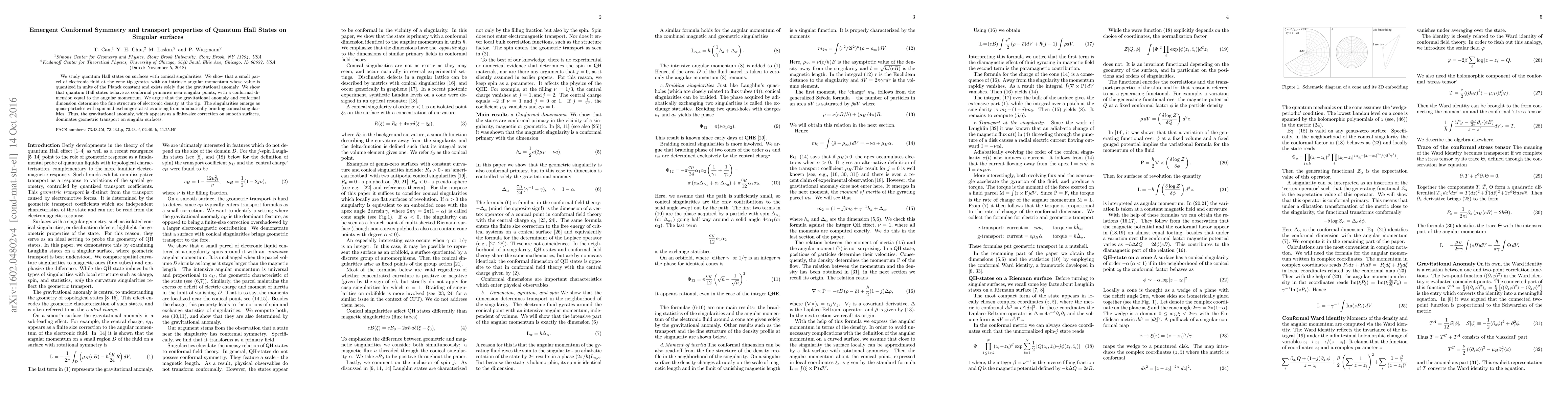 The paper presents a detailed analysis of conformal symmetry in quantum Hall states on singular surfaces, linking the gravitational anomaly to both angular momentum and exchange statistics.