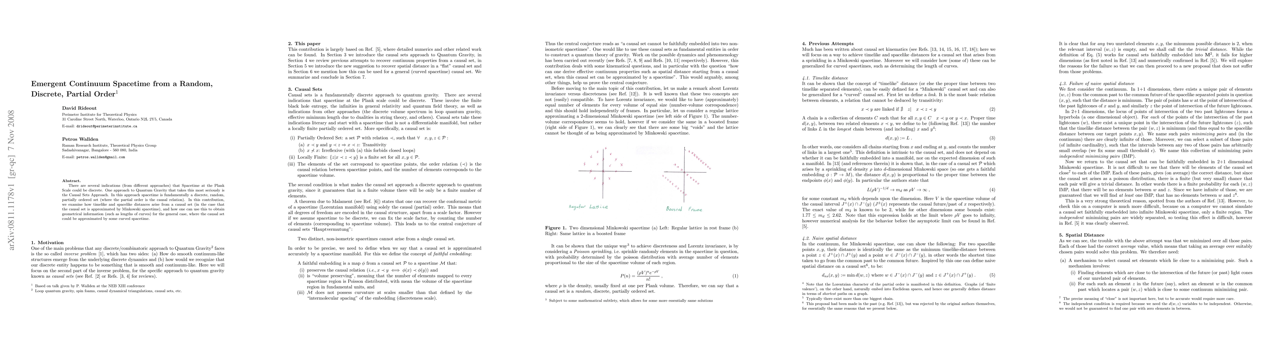 This paper explores how spacetime at the Planck scale emerges from a discrete, random, partially ordered set in the Causal Sets Approach to Quantum Gravity, demonstrating how timelike and spacelike distances arise and how geometrical information can be derived for both Minkowski and curved spacetimes.