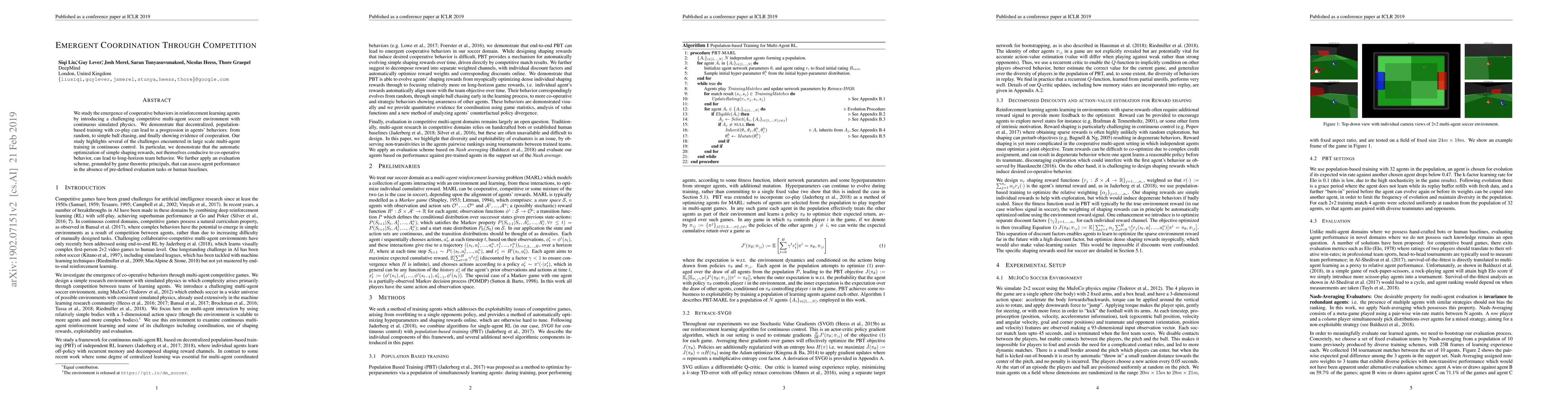We study the emergence of cooperative behaviors in reinforcement learning agents by introducing a challenging competitive multi-agent soccer environment with continuous simulated physics. We demonstrate that decentralized, population-based training with co-play can lead to a progression in agents' behaviors: from random, to simple ball chasing, and finally showing evidence of cooperation. Our study highlights several of the challenges encountered in large scale multi-agent training in continuous control. In particular, we demonstrate that the automatic optimization of simple shaping rewards, not themselves conducive to co-operative behavior, can lead to long-horizon team behavior. We further apply an evaluation scheme, grounded by game theoretic principals, that can assess agent performance in the absence of pre-defined evaluation tasks or human baselines.