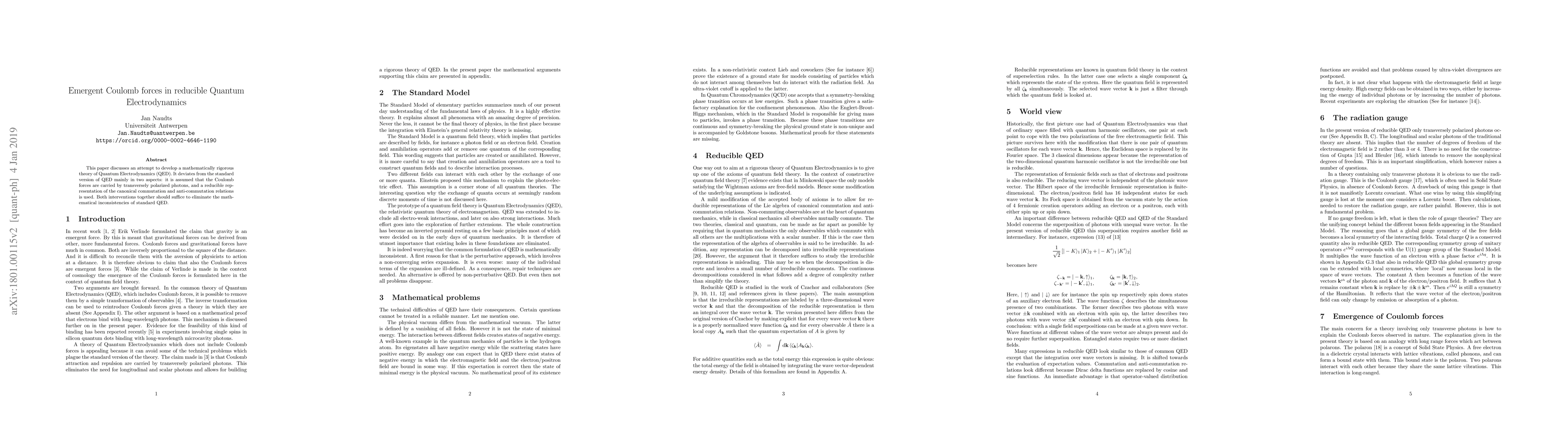 This paper discusses an attempt to develop a mathematically rigorous theory of Quantum Electrodynamics (QED). It deviates from the standard version of QED mainly in two aspects: it is assumed that the Coulomb forces are carried by transversely polarized photons, and a reducible representation of the canonical commutation and anti-commutation relations is used. Both interventions together should suffice to eliminate the mathematical inconsistencies of standard QED.